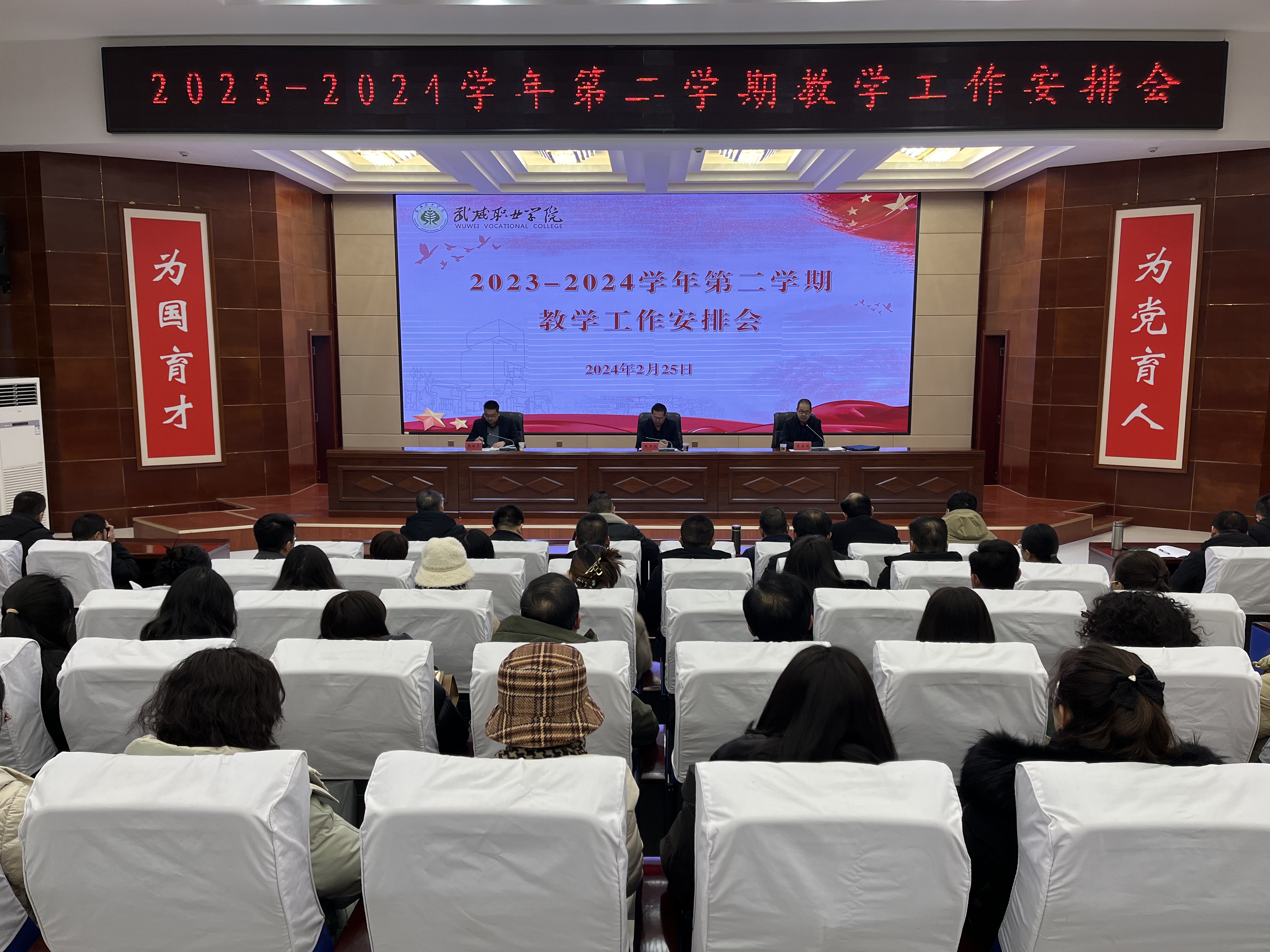 為持續(xù)推動(dòng)教學(xué)運(yùn)行與管理規(guī)范化、標(biāo)準(zhǔn)化、科學(xué)化,進(jìn)一步提升新學(xué)期教學(xué)工作成效和人才培養(yǎng)質(zhì)量,扎實(shí)推進(jìn)學(xué)校高質(zhì)量建設(shè),2月25日上午,學(xué)校在菁英廳組織召開了2023-2024學(xué)年第二學(xué)期教學(xué)工作安排會(huì)。學(xué)校校長、黨委副書記張開禮、黨委副書記翟存祥、各二級(jí)學(xué)院負(fù)責(zé)人、教學(xué)秘書、教研室主任、各專業(yè)帶頭人和教務(wù)處全體工作人員參加了會(huì)議。會(huì)議由翟存祥主持。