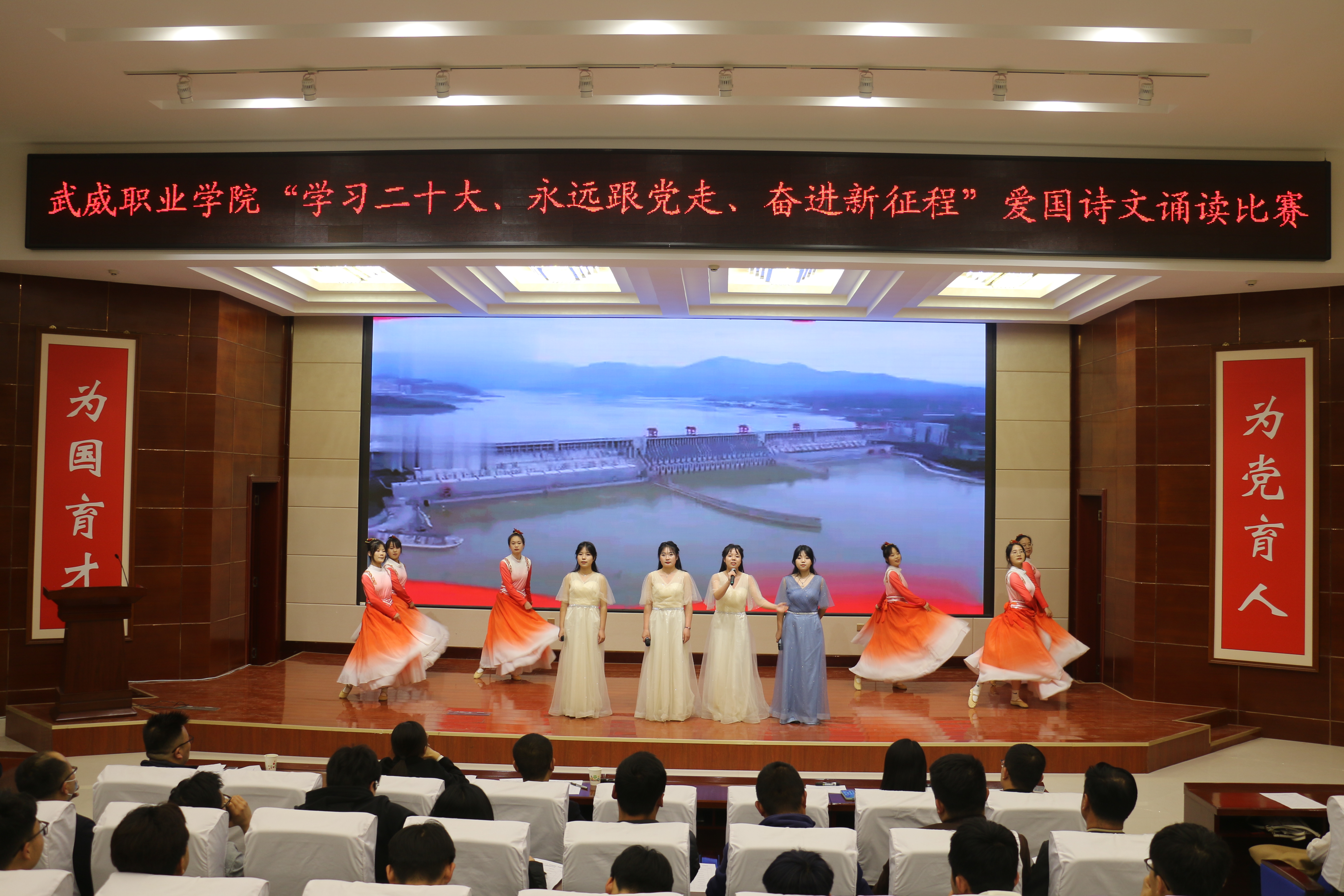 大賽于3月啟動,歷時一個月,各二級學(xué)院經(jīng)過初賽評比推選出9個優(yōu)秀節(jié)目入圍決賽。比賽現(xiàn)場,各參賽隊以“學(xué)習(xí)二十大、永遠(yuǎn)跟黨走、奮進(jìn)新征程”為主題,將傳承經(jīng)典詩文和弘揚愛國主義精神結(jié)合,誦詩抒情、借詞言志,熱情謳歌中國共產(chǎn)黨不懈奮斗的光輝歷程,全面展現(xiàn)新時代青年以夢為馬,不負(fù)韶華的青春風(fēng)貌。校團(tuán)委原創(chuàng)編排表演的節(jié)目《追夢八步沙,奮斗正青春》,深情動人,感染全場,歌頌了“六老漢”矢志艱苦奮斗的隴人品格,抒發(fā)了當(dāng)代青年永跟黨走,青春建功的豪情壯志。富余藝術(shù)感染力的經(jīng)典吟誦,穿插舞蹈、劇情和紅歌演唱,為廣大師生呈現(xiàn)了一場視聽盛宴。