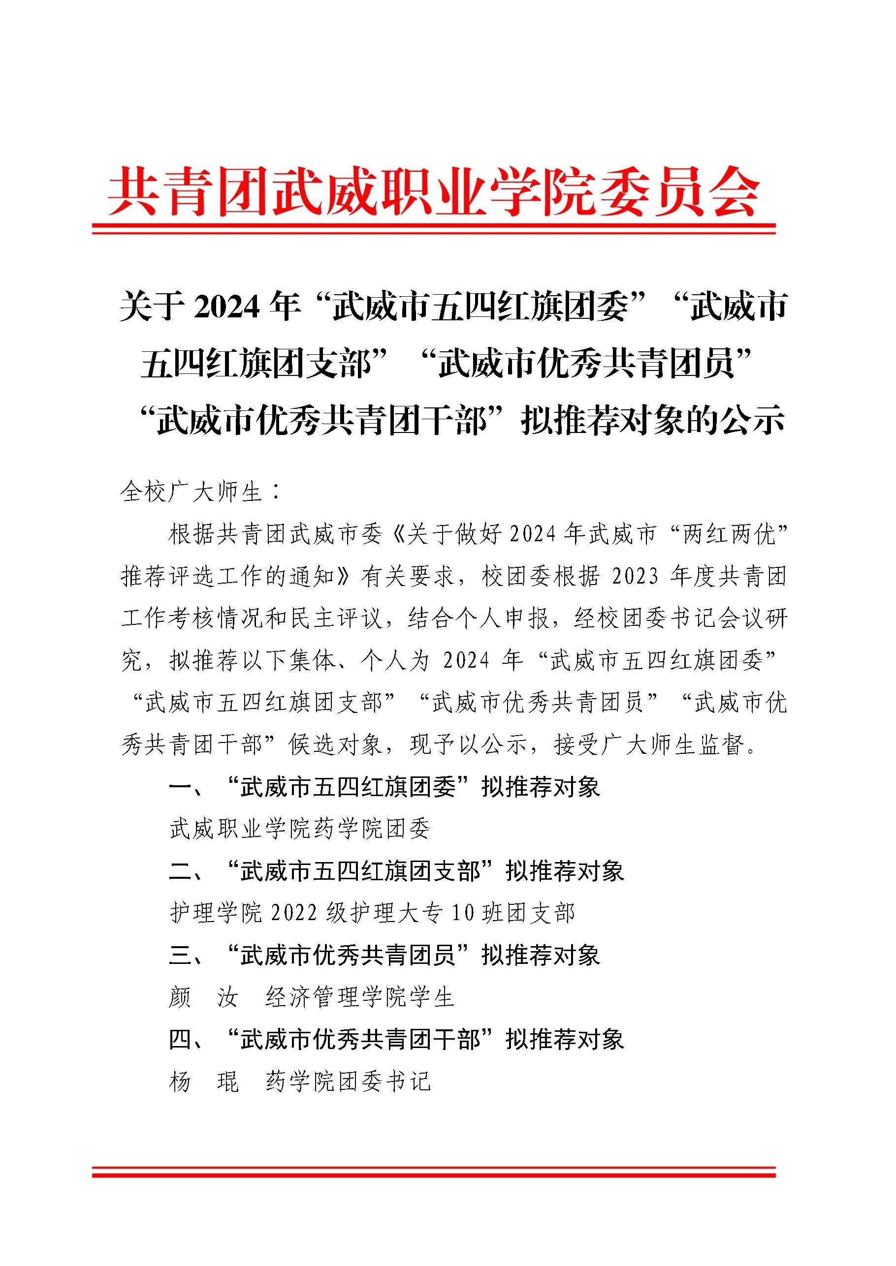關于2024年“武威市五四紅旗團委”“武威市五四紅旗團支部”“武威市優(yōu)秀共青團員”“武威市優(yōu)秀共青團干部”擬推薦對象的公示