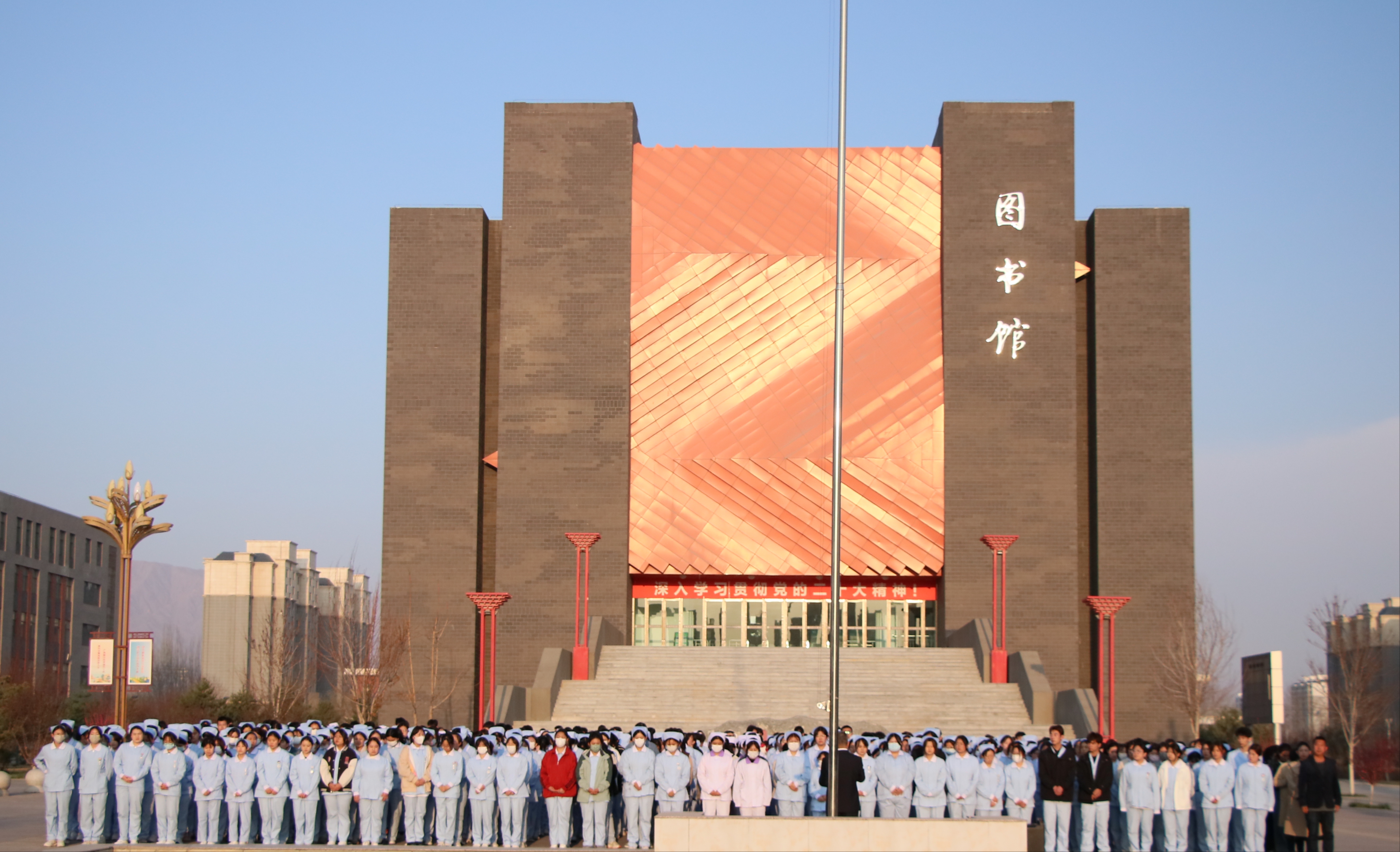 4月7日清晨,護理學院在圖書館前廣場舉行升國旗儀式,學院黨總支書記張建輝、團委書記楊杰、全體班主任及2022、2023級全體學生參加此次升旗儀式,儀式由楊杰主持。