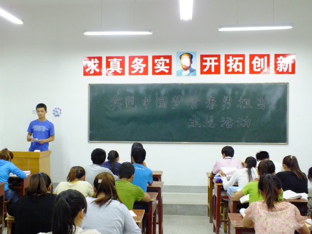 2013年5月20日,藥學(xué)系組織全體班團(tuán)干部在4號(hào)教學(xué)樓410教室開展了“實(shí)現(xiàn)中國(guó)夢(mèng),青春勇?lián)?dāng)”的主題班團(tuán)干部會(huì)活動(dòng),同學(xué)們認(rèn)真聆聽了習(xí)近平在同各界優(yōu)秀青年代表座談時(shí)的講話,習(xí)近平強(qiáng)調(diào),青年最富有朝氣,最富有夢(mèng)想,青年興則國(guó)興,青年強(qiáng)則國(guó)強(qiáng)。