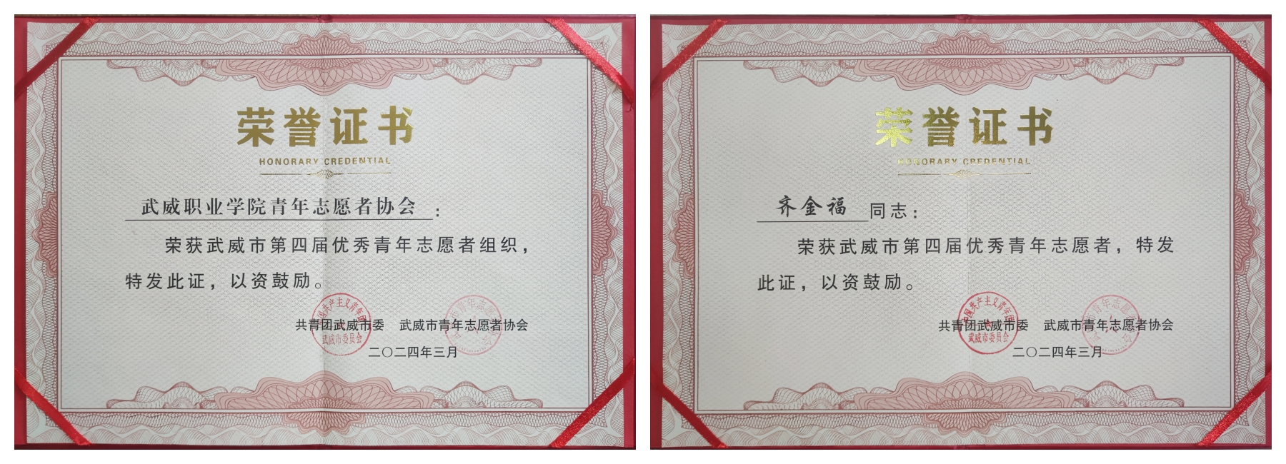 會議全面總結了2023年全市青年志愿服務工作情況,對獲得武威市第四屆優(yōu)秀志愿者組織和個人的集體和單位頒發(fā)榮譽證書。我校青年志愿者協會被評為“優(yōu)秀志愿者組織”,工程技術學院學生齊金福被評為“優(yōu)秀志愿者”。