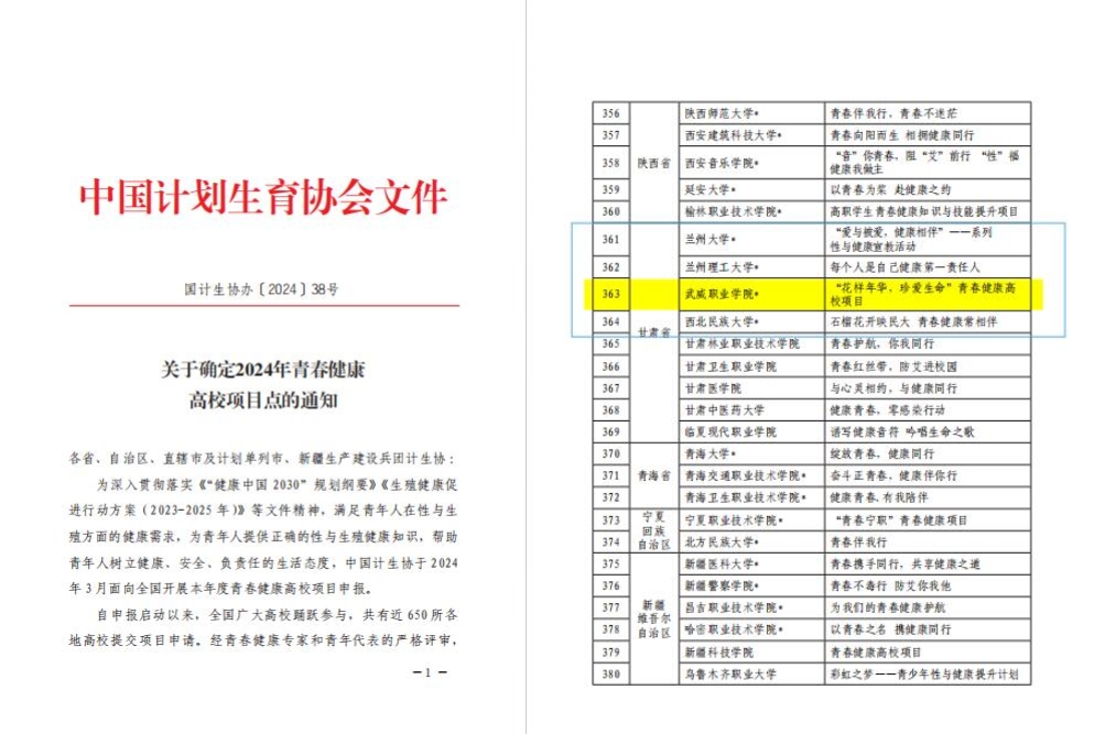 日前,中國計劃生育協(xié)會發(fā)布《關(guān)于確定2024年青春健康高校項目點的通知》,我校學(xué)生工作部、校團(tuán)委、護(hù)理學(xué)院共同申報的“花樣年華,珍愛生命”項目,從全國各地500余所高校中脫穎而出,自2022年以來連續(xù)三次成功中標(biāo)中國計生協(xié)專項資助A類項目,成為甘肅省中標(biāo)A類項目院校中唯一一所高職院校。