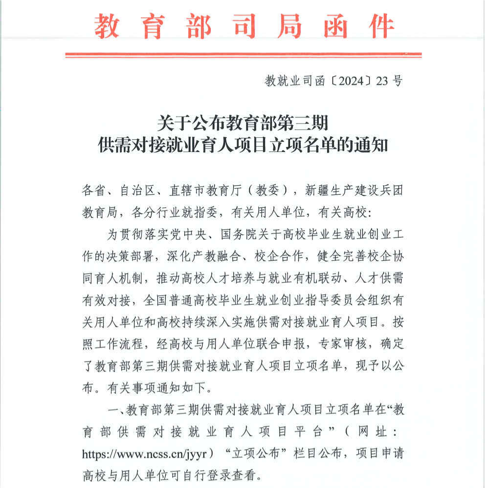 供需對接就業(yè)育人項目是教育部貫徹落實黨中央、國務院“穩(wěn)就業(yè)”“保就業(yè)”決策部署的舉措之一,旨在深化產(chǎn)教融合、校企合作,推動人才培養(yǎng)與就業(yè)有機聯(lián)動、人才供需有效對接的有效途徑。供需對接就業(yè)育人項目由高校和用人單位共同申報,經(jīng)教育部組織專家審核立項。用人單位提供項目專項經(jīng)費和資源支持,通過與高校開展定向人才培養(yǎng)、就業(yè)實習等合作,培養(yǎng)更多高素質(zhì)技術(shù)技能型人才。