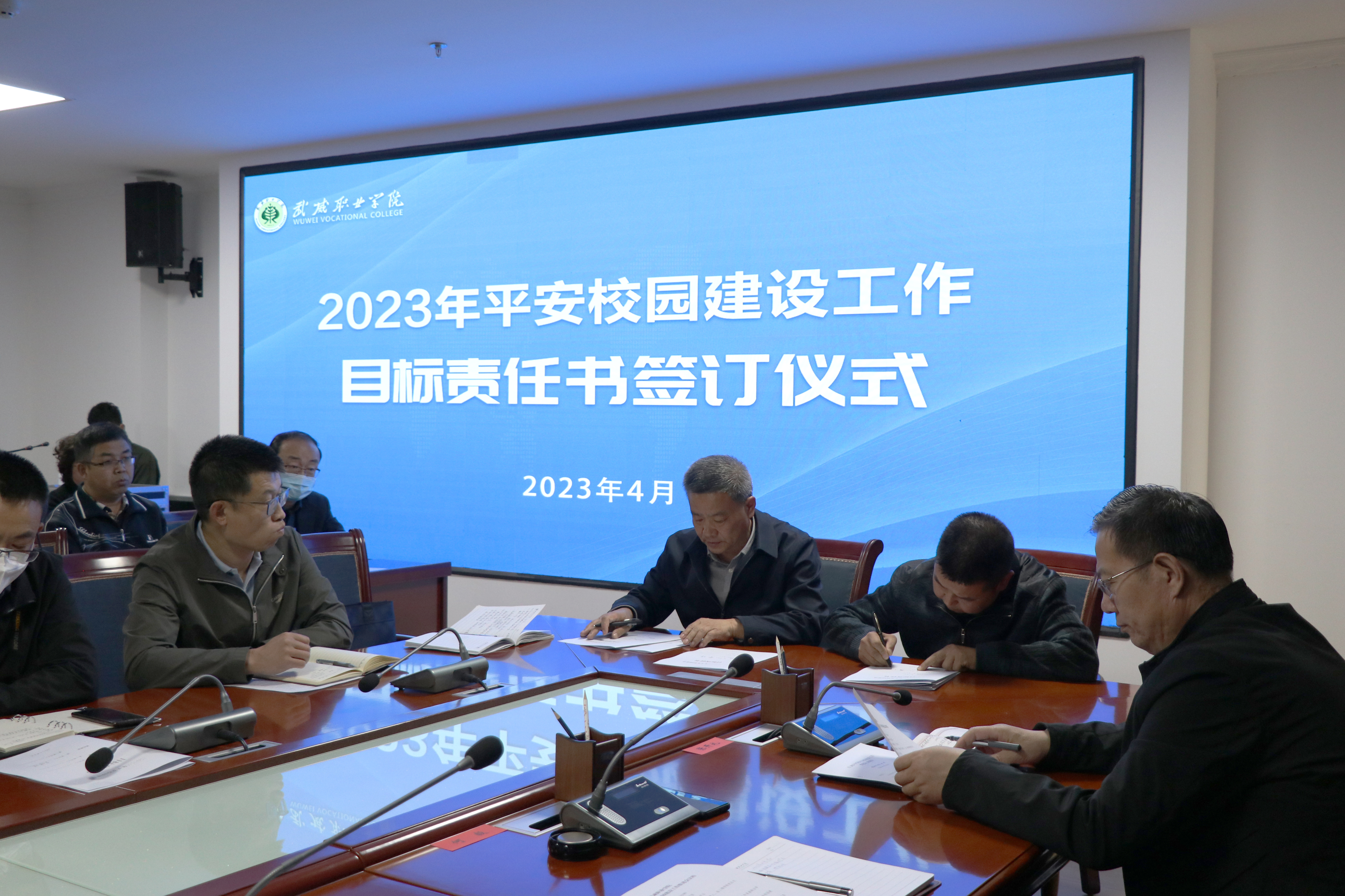 趙明與各部門、二級(jí)學(xué)院簽訂了2023年平安校園建設(shè)工作目標(biāo)責(zé)任書。王守云結(jié)合學(xué)校實(shí)際,對2023年平安校園建設(shè)工作作了安排。