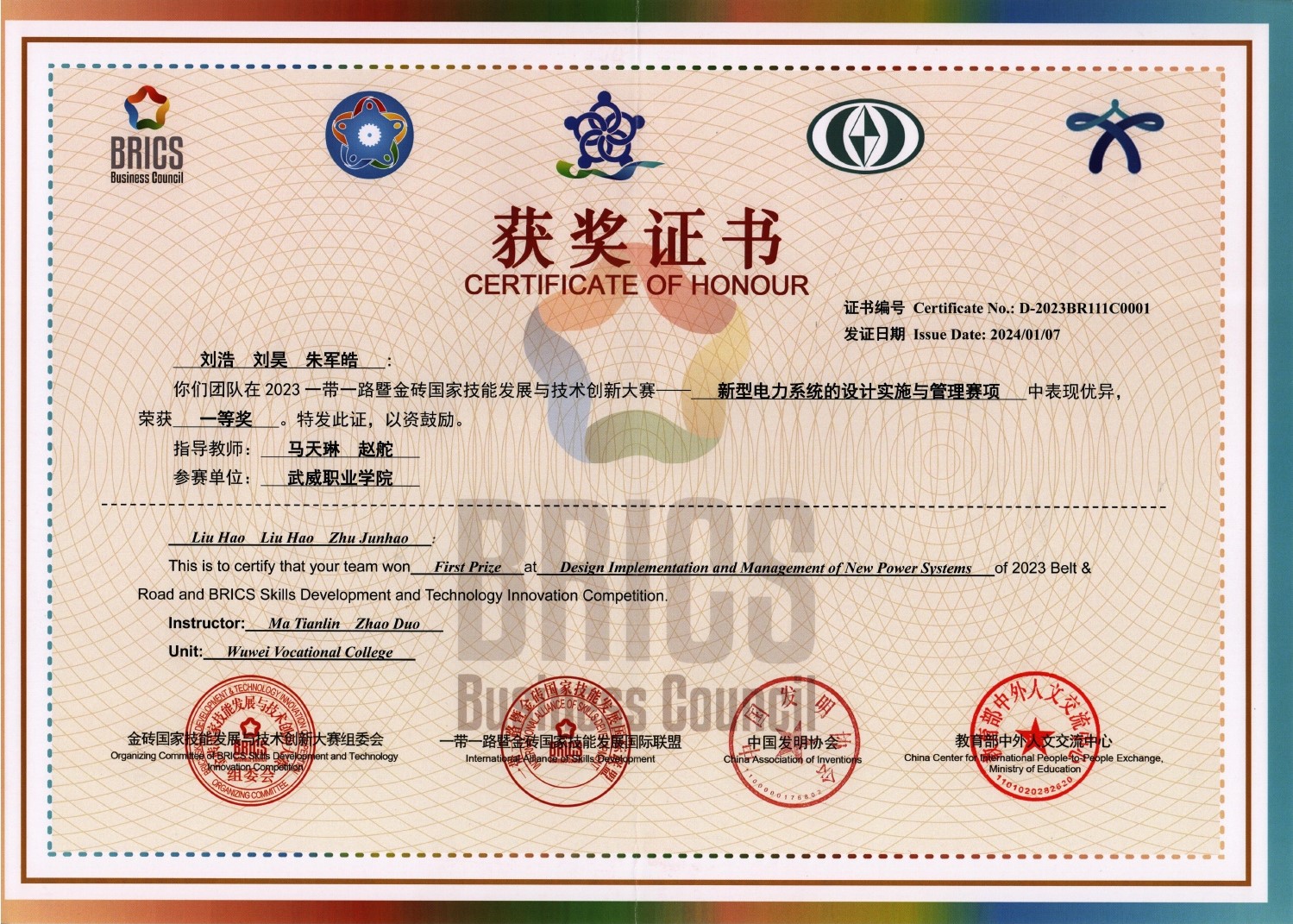 2023年一帶一路暨金磚國家技能發(fā)展與技術(shù)創(chuàng)新大賽新型電力系統(tǒng)的設(shè)計(jì)實(shí)施賽項(xiàng)一等獎(jiǎng)