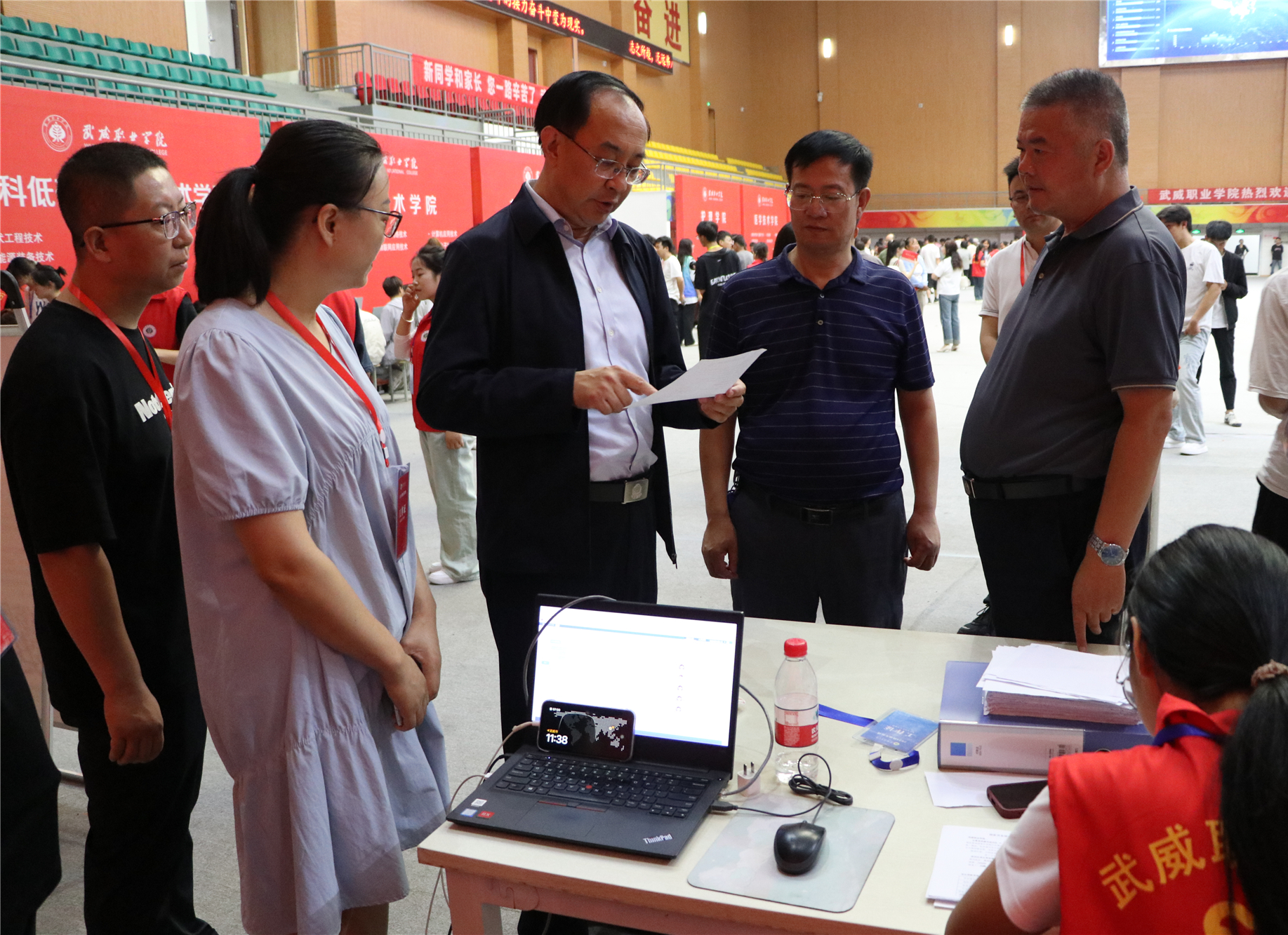 校領(lǐng)導(dǎo)一一走過新生報到處、綠色通道、繳費處和各二級學(xué)院迎新報到點,了解新生報到情況,仔細詢問智慧學(xué)工平臺使用情況,親切問候堅守崗位的師生志愿者。在醫(yī)學(xué)技術(shù)學(xué)院報到點前,王宏與2024級放射治療技術(shù)(重離子方向)新生及家長聊了起來——“歡迎你們來到武威職業(yè)學(xué)院學(xué)習(xí)!為什么會報考這個專業(yè)?”在得知學(xué)生家庭中有人從事重離子醫(yī)療領(lǐng)域的研發(fā)工作時,王宏勉勵新生要努力學(xué)好專業(yè)、練好技能,爭做高素質(zhì)技術(shù)技能人才。在家長休息區(qū),王宏與來自甘肅慶陽的新生家長親切交談,并介紹了學(xué)校的辦學(xué)情況,建議學(xué)生和家長在校園里走一走看一看,多了解熟悉學(xué)校,幫助學(xué)生盡快適應(yīng)大學(xué)生活,并祝愿學(xué)生家長在武期間,一切順利。