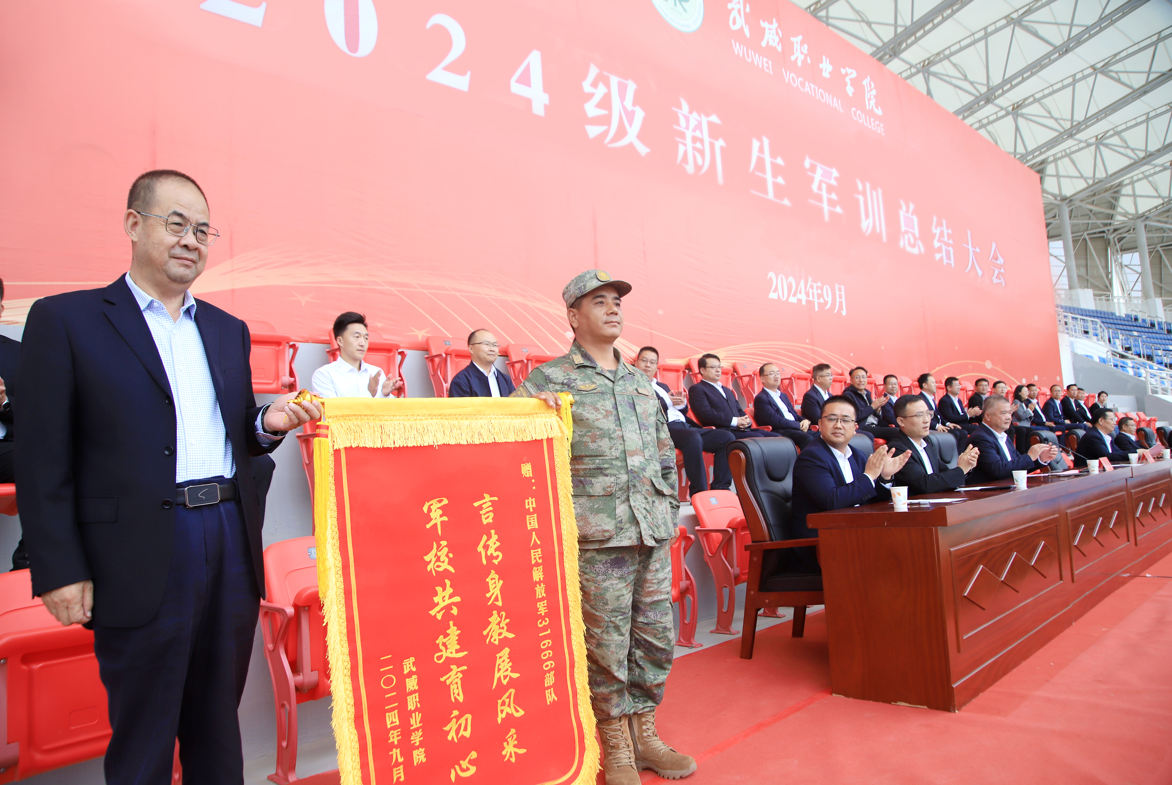 會上,翟存祥代表學校向承訓部隊贈送錦旗致以崇高的敬意,向奮戰(zhàn)在訓練一線的軍訓教官及工作人員表示衷心的感謝!陳曉煜宣讀了2024級新生軍訓工作先進集體、先進個人、優(yōu)秀教官和軍訓標兵擬表彰名單。與會領導為軍訓先進集體和個人頒發(fā)了獎牌和榮譽證書。