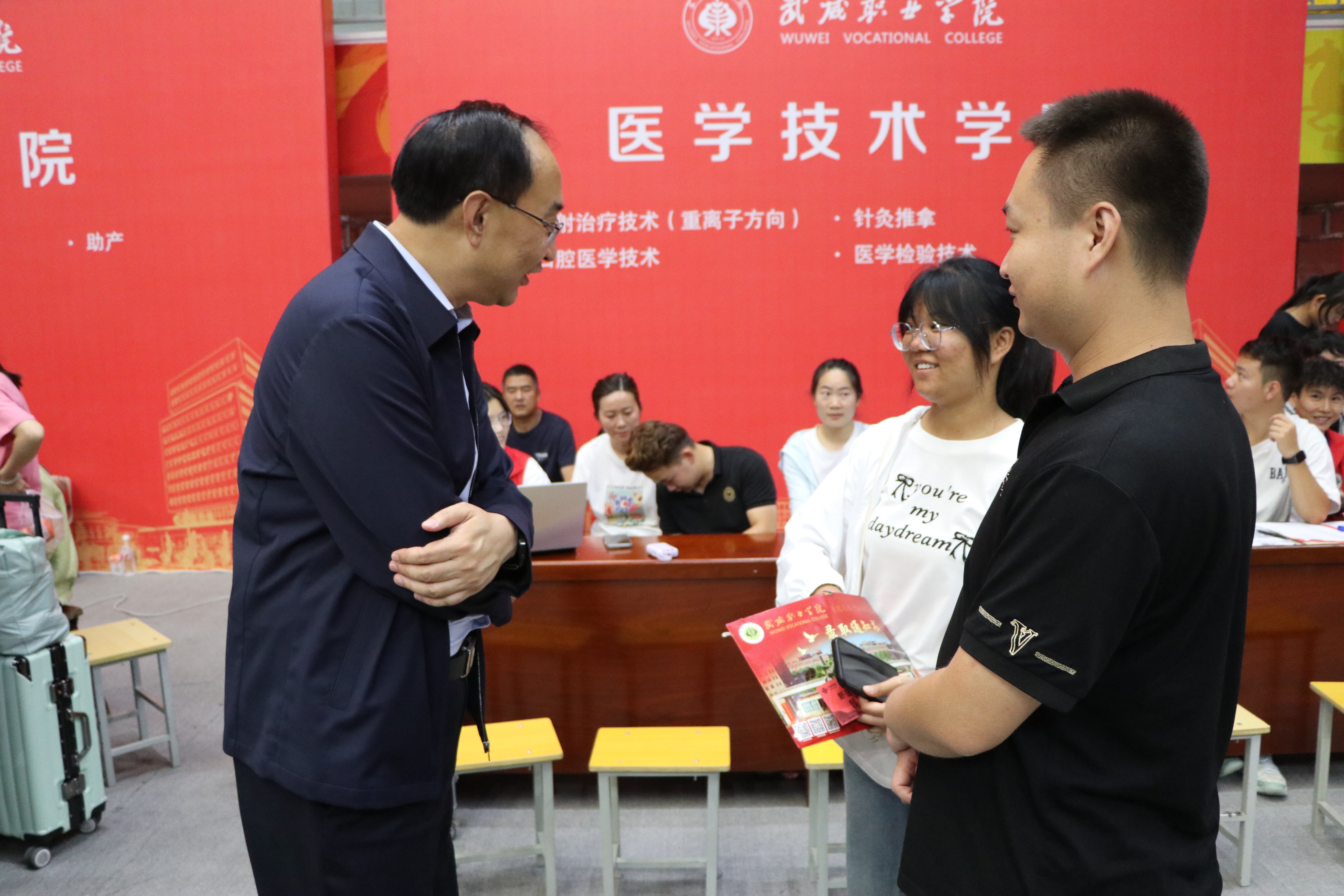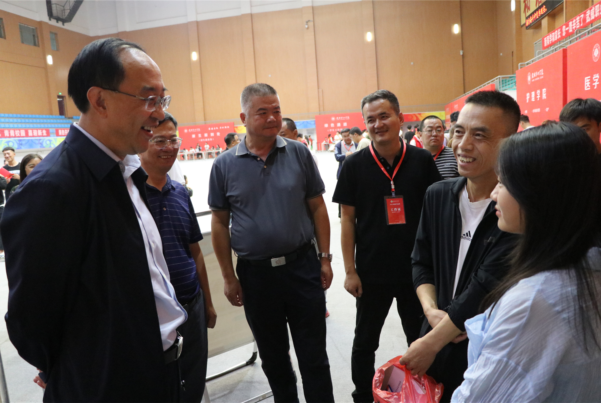 校領(lǐng)導(dǎo)一一走過(guò)新生報(bào)到處、綠色通道、繳費(fèi)處和各二級(jí)學(xué)院迎新報(bào)到點(diǎn),了解新生報(bào)到情況,仔細(xì)詢問(wèn)智慧學(xué)工平臺(tái)使用情況,親切問(wèn)候堅(jiān)守崗位的師生志愿者。在醫(yī)學(xué)技術(shù)學(xué)院報(bào)到點(diǎn)前,王宏與2024級(jí)放射治療技術(shù)(重離子方向)新生及家長(zhǎng)聊了起來(lái)——“歡迎你們來(lái)到武威職業(yè)學(xué)院學(xué)習(xí)!為什么會(huì)報(bào)考這個(gè)專業(yè)?”在得知學(xué)生家庭中有人從事重離子醫(yī)療領(lǐng)域的研發(fā)工作時(shí),王宏勉勵(lì)新生要努力學(xué)好專業(yè)、練好技能,爭(zhēng)做高素質(zhì)技術(shù)技能人才。在家長(zhǎng)休息區(qū),王宏與來(lái)自甘肅慶陽(yáng)的新生家長(zhǎng)親切交談,并介紹了學(xué)校的辦學(xué)情況,建議學(xué)生和家長(zhǎng)在校園里走一走看一看,多了解熟悉學(xué)校,幫助學(xué)生盡快適應(yīng)大學(xué)生活,并祝愿學(xué)生家長(zhǎng)在武期間,一切順利。