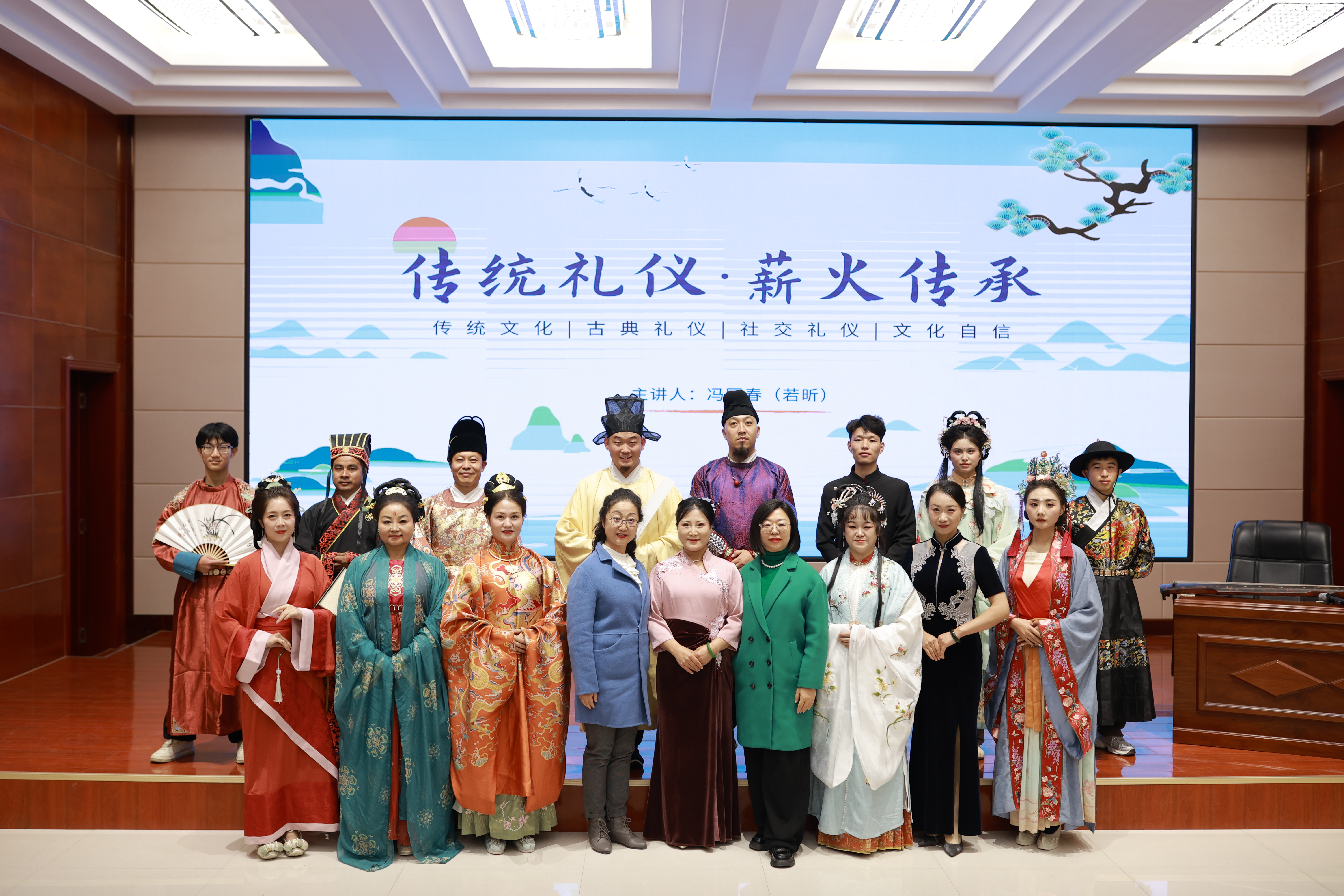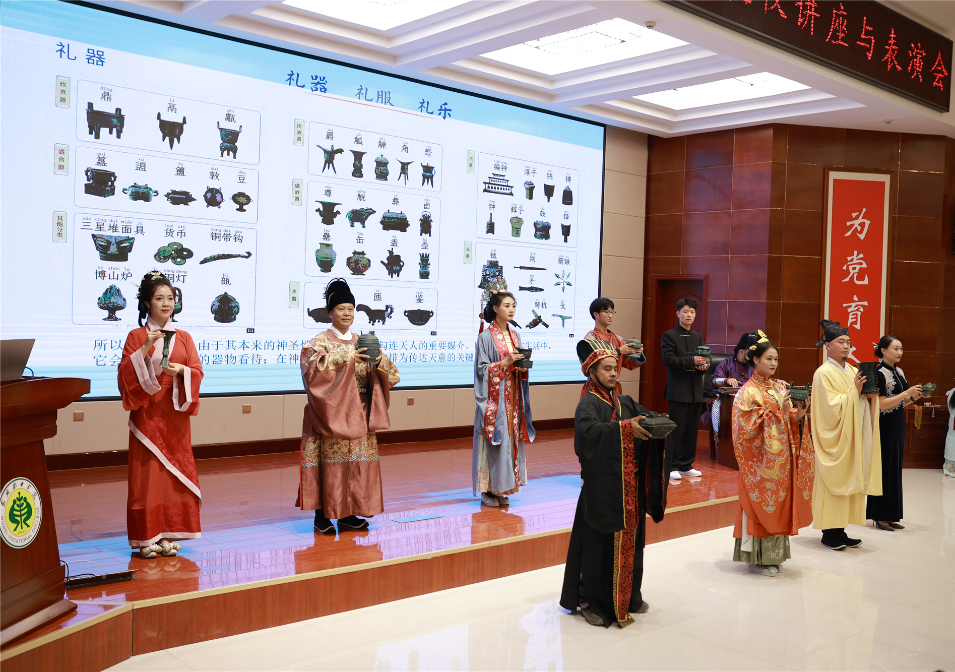 馮國春老師以深厚的學識和豐富的經(jīng)驗,詳細向?qū)W生們講解了各個歷史時期的傳統(tǒng)禮儀,從禮器、禮服到禮樂,每一個朝代都生動而詳盡。團隊成員將禮儀通過現(xiàn)場示范的方式呈現(xiàn)給在場的每一位同學。他們不僅展示了禮儀的外在形式,更傳達了禮儀背后的文化內(nèi)涵和精神價值。