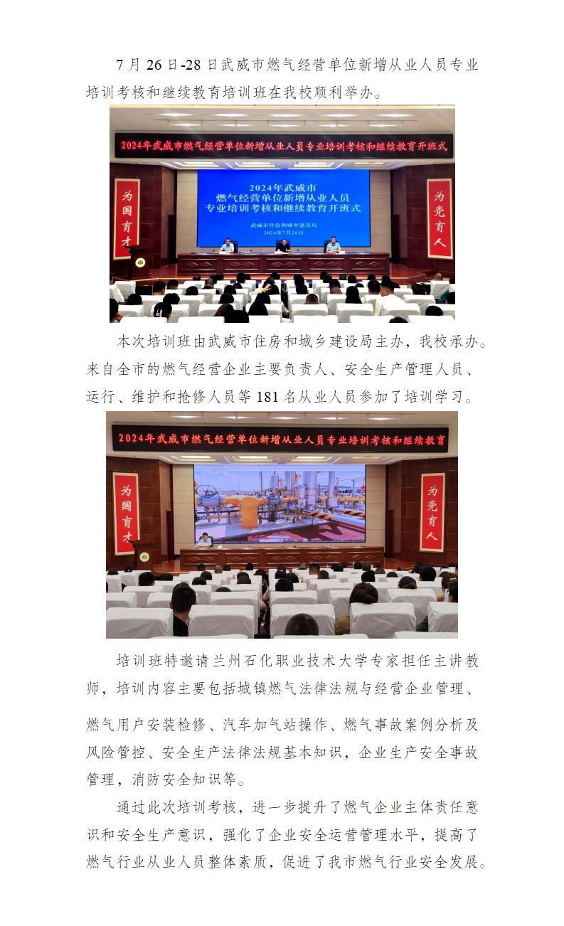 2024年武威市燃氣經營單位新增從業(yè)人員專業(yè)培訓考核和繼續(xù)教育培訓班在我校成功舉辦