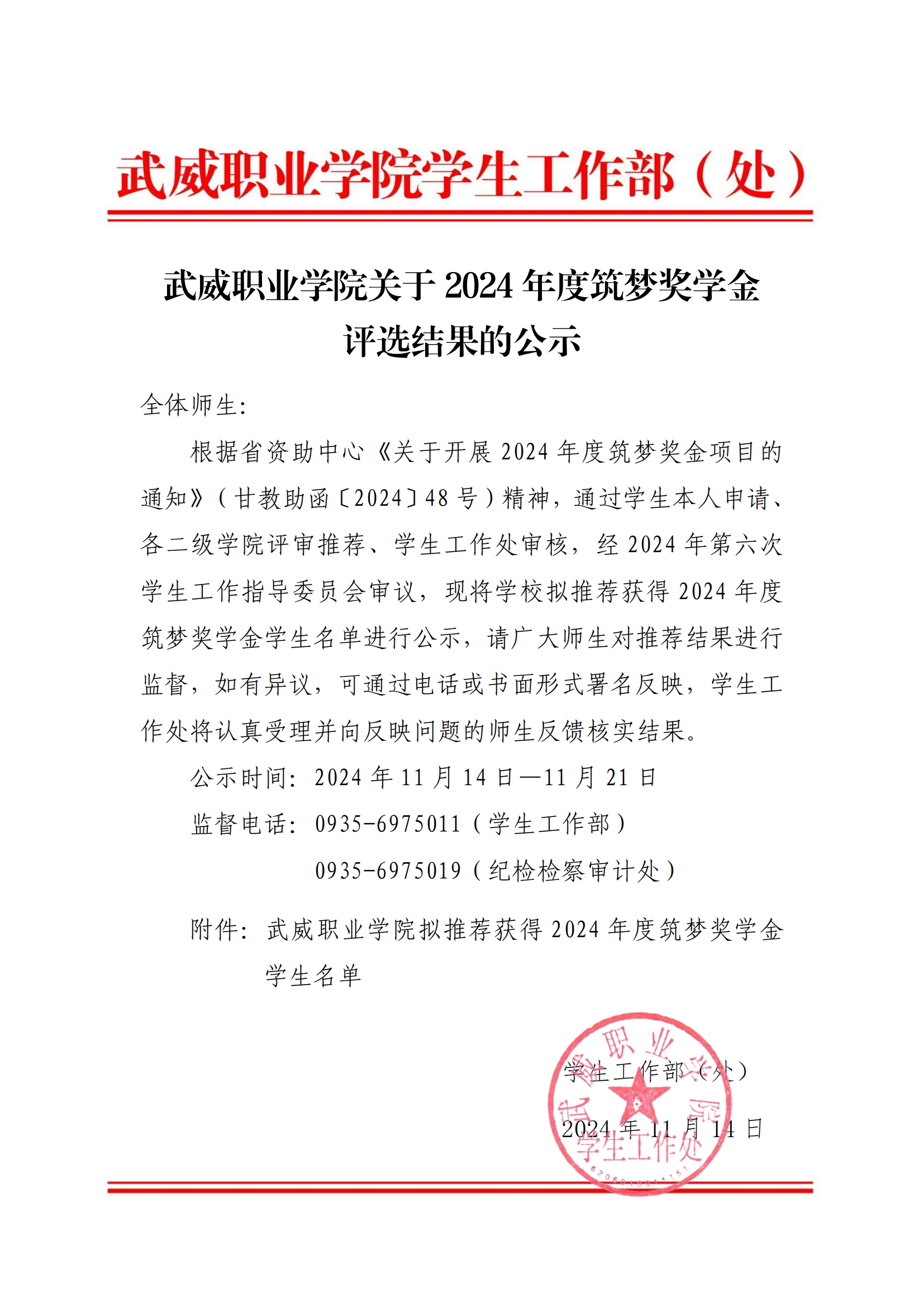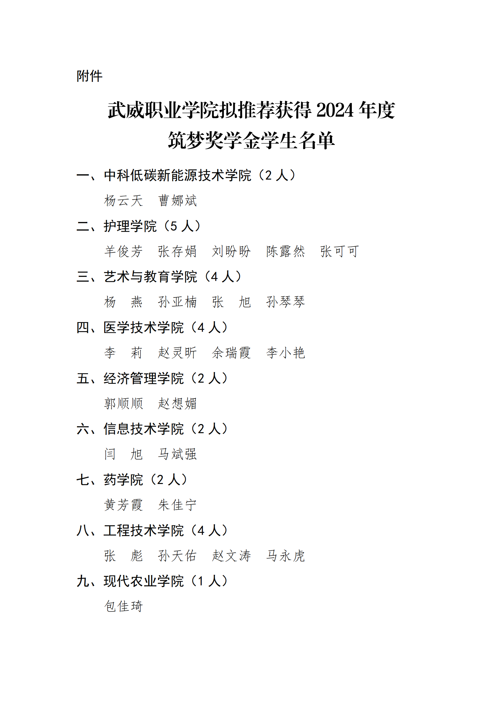 武威職業(yè)學院關于2024年度筑夢獎學金評選結果的公示