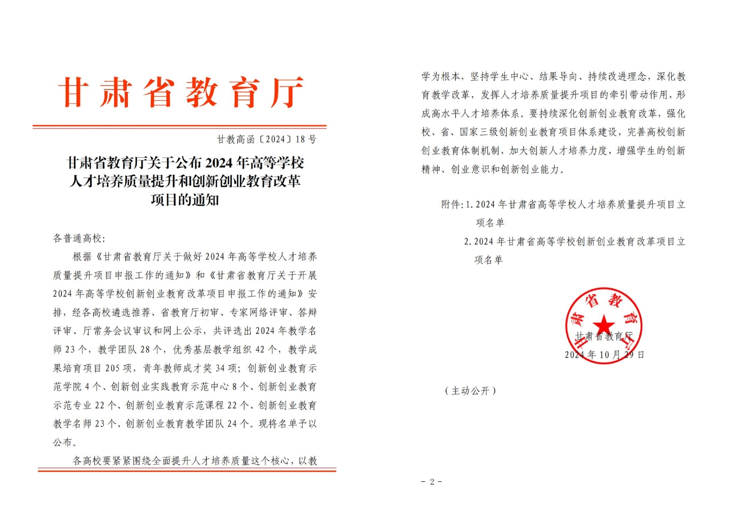 創(chuàng)新創(chuàng)業(yè)教育改革項目是為深入貫徹落實《國務院辦公廳關于進一步支持大學生創(chuàng)新創(chuàng)業(yè)的指導意見》(國辦發(fā)〔2021〕35 號)、《甘肅省教育廳等十三部門印發(fā)〈甘肅省關于進一步支持大學生創(chuàng)新創(chuàng)業(yè)的若干措施〉的通知》(甘教高〔2022〕3 號)等精神,推動全省高等學校持續(xù)深化創(chuàng)新創(chuàng)業(yè)教育改革,主動融入產業(yè)轉型升級和創(chuàng)新驅動發(fā)展戰(zhàn)略,提高人才培養(yǎng)質量的重要舉措。本次認定的4項創(chuàng)新創(chuàng)業(yè)教育改革項目,是對我校創(chuàng)新創(chuàng)業(yè)工作的肯定,也對學校高質量發(fā)展,提升人才培養(yǎng)質量具有重要的推動作用。