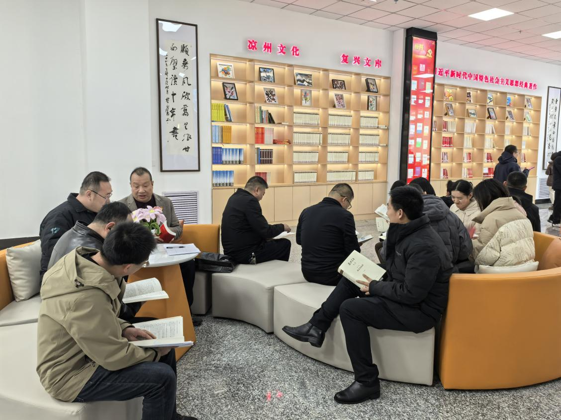 黨員們圍坐在書架旁,認真閱讀關(guān)于習(xí)近平新時代中國特色社會主義思想書籍。書籍涵蓋了黨的創(chuàng)新理論、實踐探索、歷史經(jīng)驗等多方面內(nèi)容。閱讀結(jié)束后,全體黨員在研討交流室集中觀看了視頻《中國共產(chǎn)黨人精神譜系》,并開展了研討。
