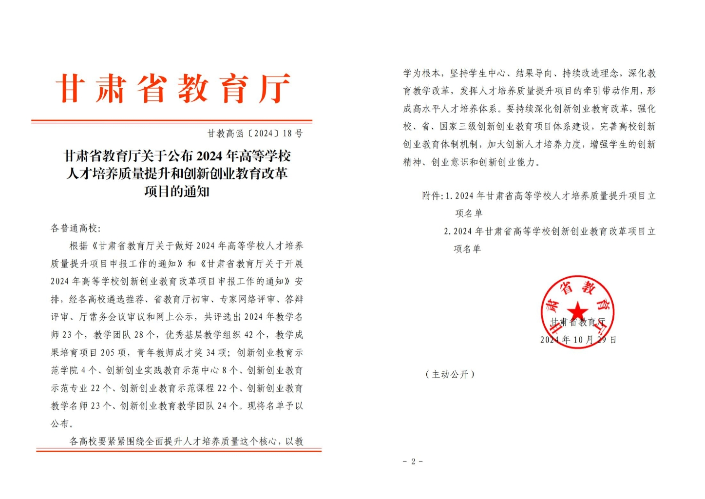 近日,甘肅省教育廳下發(fā)《關(guān)于公布2024年高等學(xué)校人才培養(yǎng)質(zhì)量提升和創(chuàng)新創(chuàng)業(yè)教育改革項(xiàng)目的通知》(甘教高函〔2024〕18 號(hào)),藥學(xué)院申報(bào)的藥學(xué)專(zhuān)業(yè)獲批創(chuàng)新創(chuàng)業(yè)教育示范專(zhuān)業(yè)。
