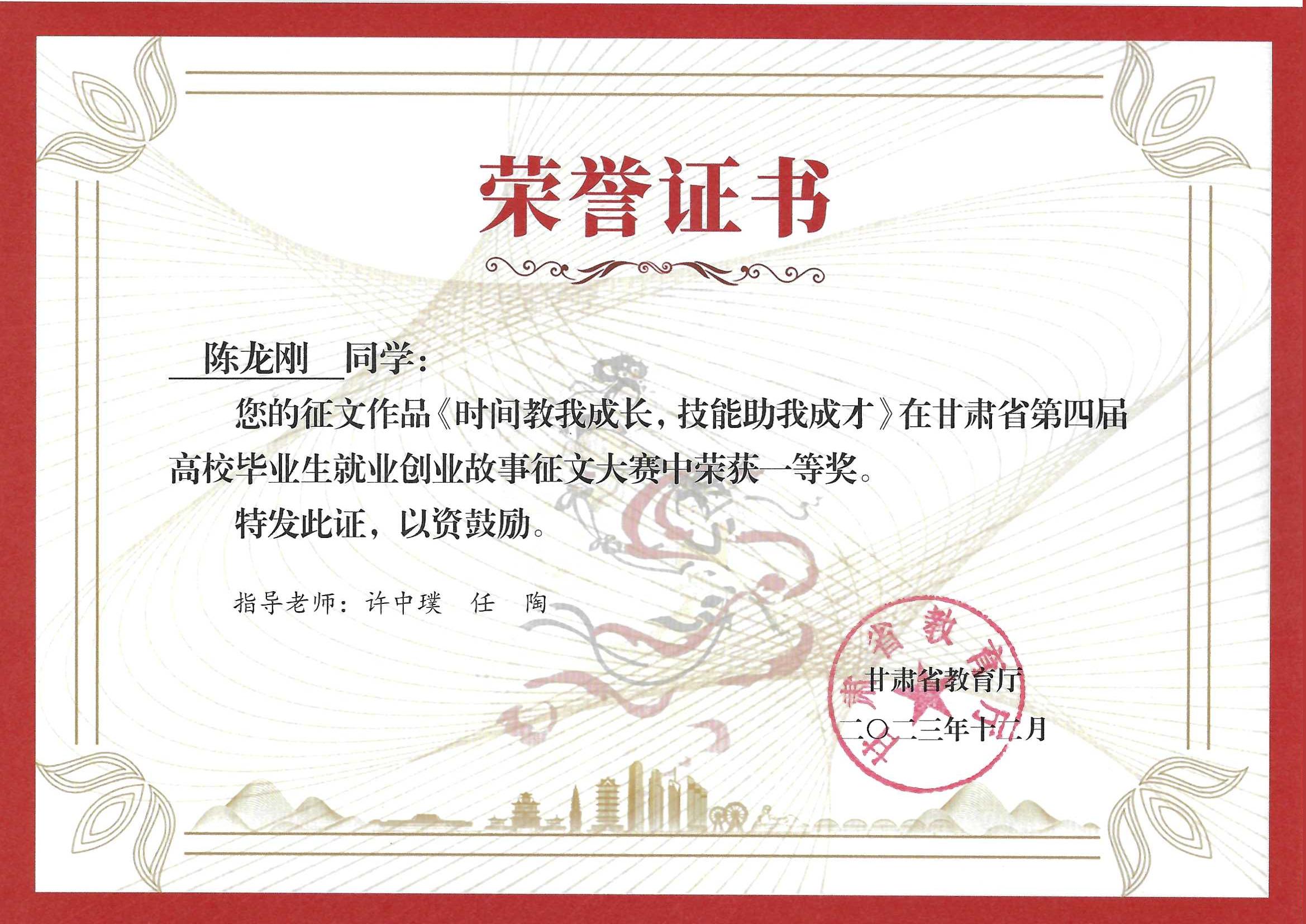 2023年學(xué)生在甘肅省第四屆高校畢業(yè)生就業(yè)創(chuàng)業(yè)故事征文大賽獲一等獎(jiǎng)