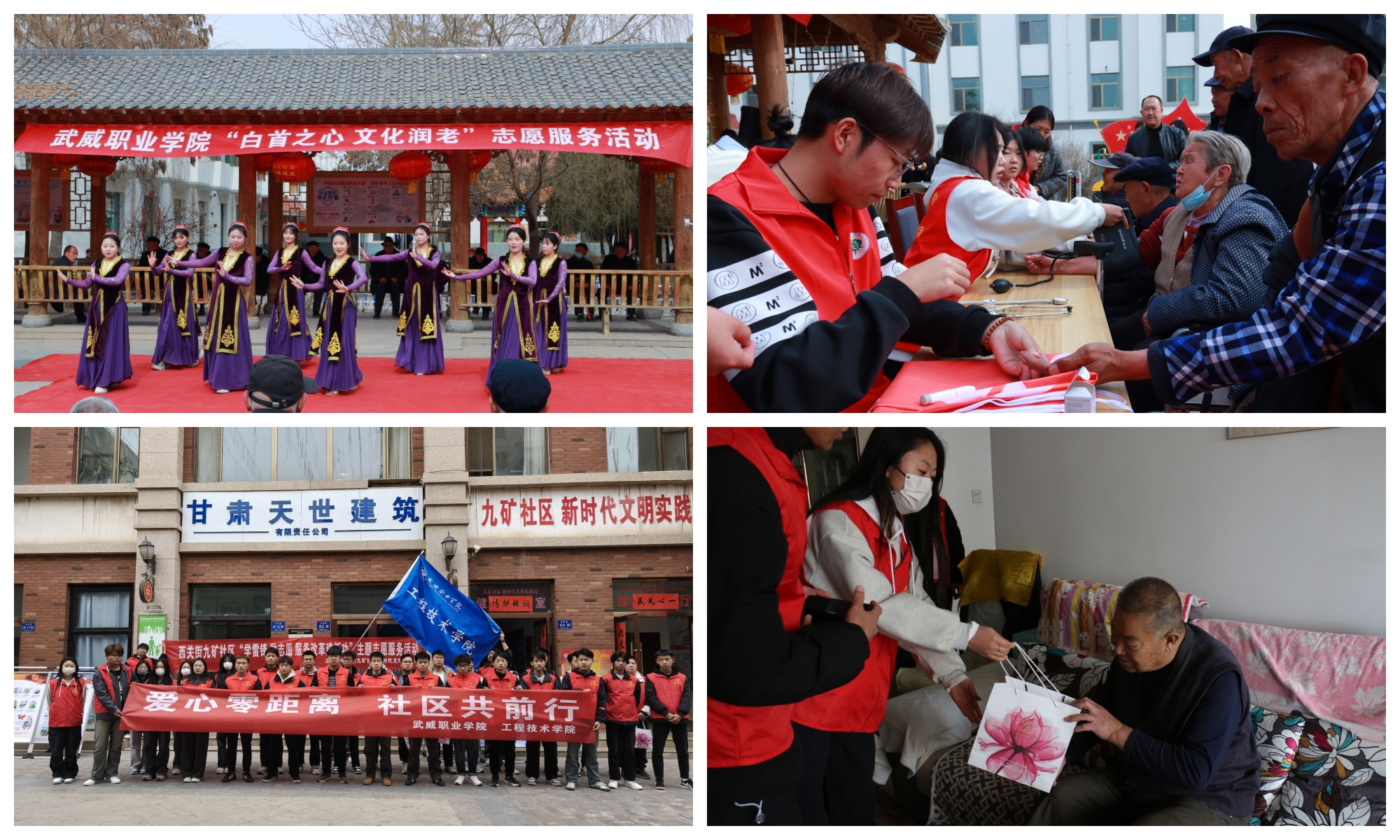 開(kāi)展愛(ài)老敬老志愿服務(wù)活動(dòng)。3月21日,校團(tuán)委組織50余名護(hù)理和學(xué)前教育專業(yè)志愿者,前往涼州區(qū)中心敬老院開(kāi)展“白首之心·文化潤(rùn)老”志愿服務(wù)活動(dòng),為老人捐贈(zèng)生活用品和愛(ài)心物資,開(kāi)展文藝表演慰問(wèn)演出,為老人測(cè)量血壓、血糖,告知在日常生活起居中的注意事項(xiàng),以專業(yè)技能守護(hù)老人健康。3月5日,工程技術(shù)學(xué)院35名志愿者走進(jìn)西關(guān)街九條嶺礦區(qū)社區(qū),開(kāi)展“愛(ài)心零距離社區(qū)共前行”志愿服務(wù)活動(dòng),為社區(qū)孤寡老人、獨(dú)居老人和老黨員等特殊家庭送上慰問(wèn)品,打掃衛(wèi)生、擦拭家具,幫忙照料綠植,并與社區(qū)工作者一起規(guī)范擺放社區(qū)內(nèi)亂停亂放的自行車(chē)、電動(dòng)車(chē),清潔窗戶、地面,營(yíng)造整潔有序的社區(qū)環(huán)境。