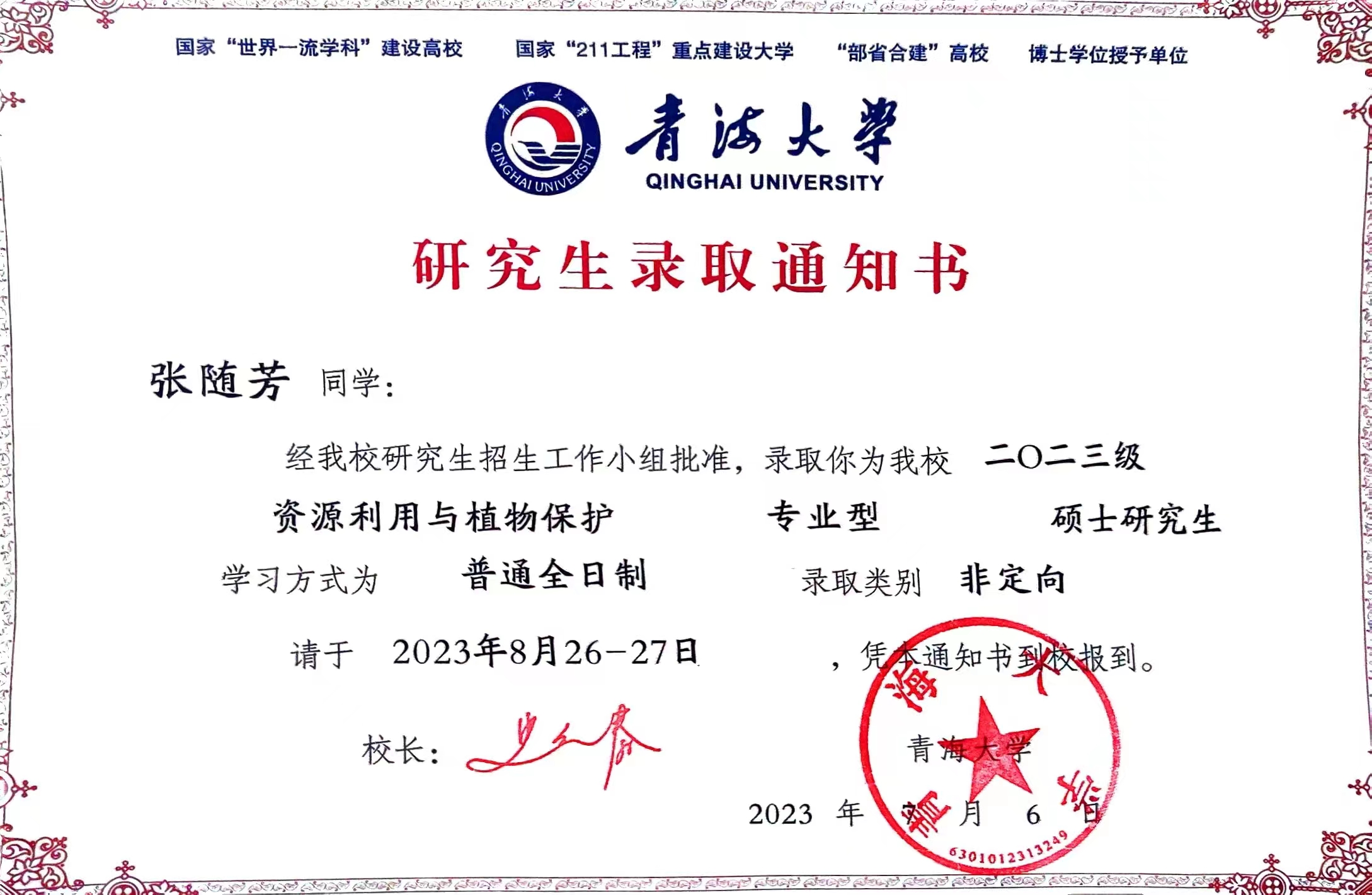 張隨芳,2018級植物保護與檢疫技術(shù)大專班,2021年考取河西學(xué)院農(nóng)學(xué)本科專業(yè),2023年考取青海大學(xué)資源利用與植物保護專業(yè)碩士研究生。
