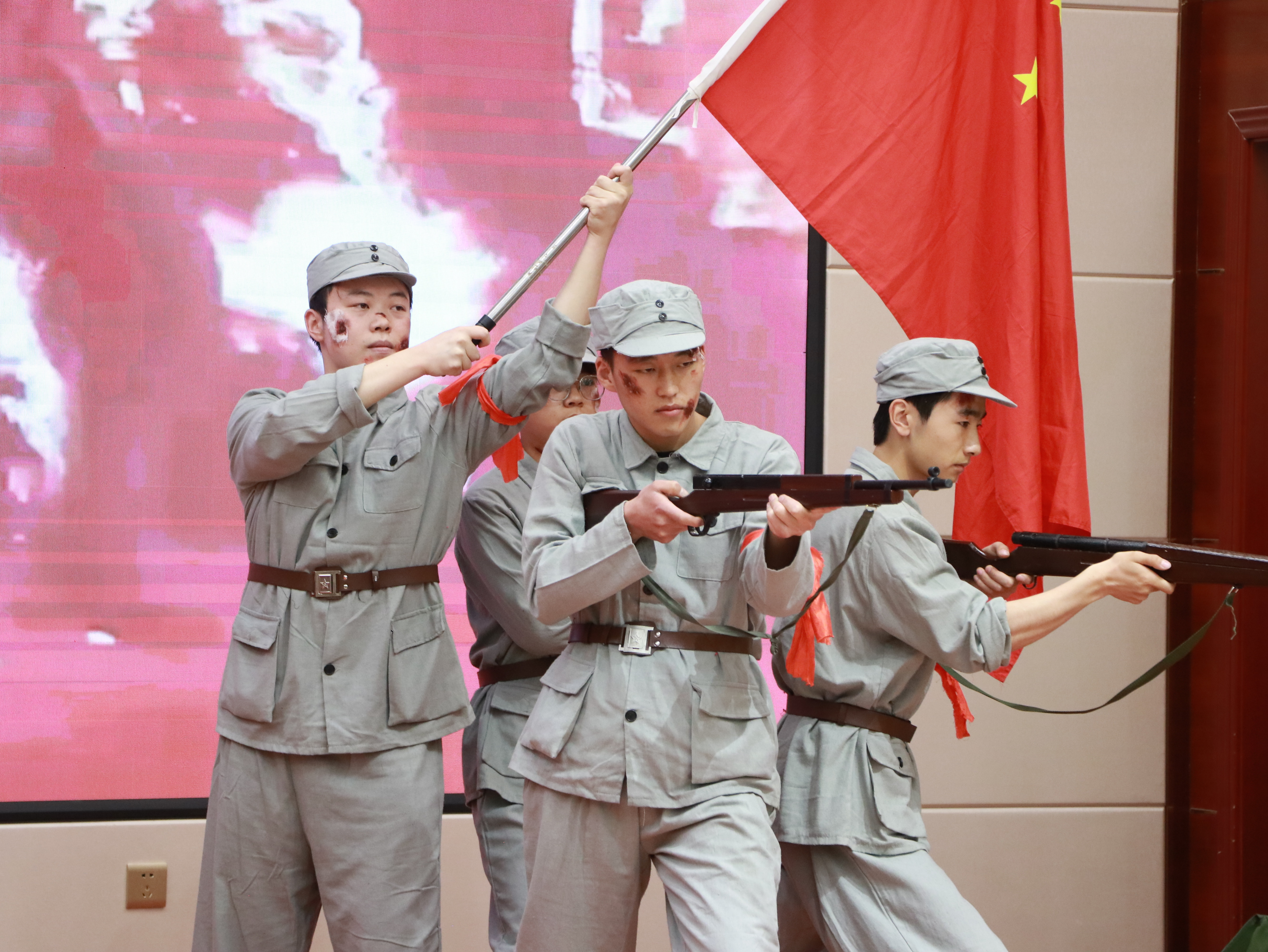 比賽現(xiàn)場,各參賽隊伍以“誦、演、歌、頌”的復合表達,帶領觀眾穿越歷史烽煙,重現(xiàn)那段氣壯山河的抗戰(zhàn)歲月。他們或慷慨激昂地講述革命先輩寧死不屈的壯舉,或手持泛黃家書深情誦讀,絕筆信中的母愛與家國大義在顫抖的聲線中重現(xiàn);或化身硝煙中的戰(zhàn)士,用染血繃帶與折斷鋼槍演繹出“十萬青年十萬軍”的悲壯群像。那些被歲月蝕刻的墨跡,此刻正在當代青年的瞳孔里重新燃燒。一句句飽含深情的誦讀,一幕幕震撼人心的演繹,都傳遞著同學們對抗戰(zhàn)英烈的深切緬懷與崇高敬意。現(xiàn)場掌聲如潮水般此起彼伏,經久不息,激蕩著每一位觀眾的愛國情懷。