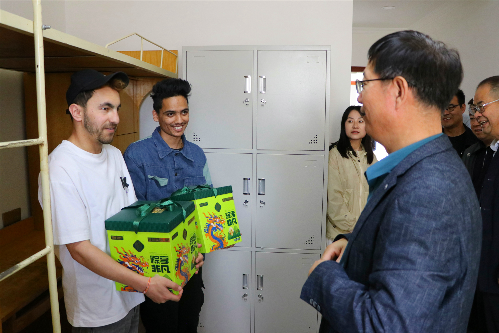 端午將至,為更好開展留學生教育管理工作,使我校來華留學生更好地認識和體驗中國傳統(tǒng)節(jié)日文化,5月30日,學校黨委副書記、副校長張開禮,黨委副書記翟存祥,黨委委員、副校長王守云一行與國際合作交流處全體工作人員走進留學生公寓,給留學生們送去節(jié)日的關(guān)懷和溫暖。