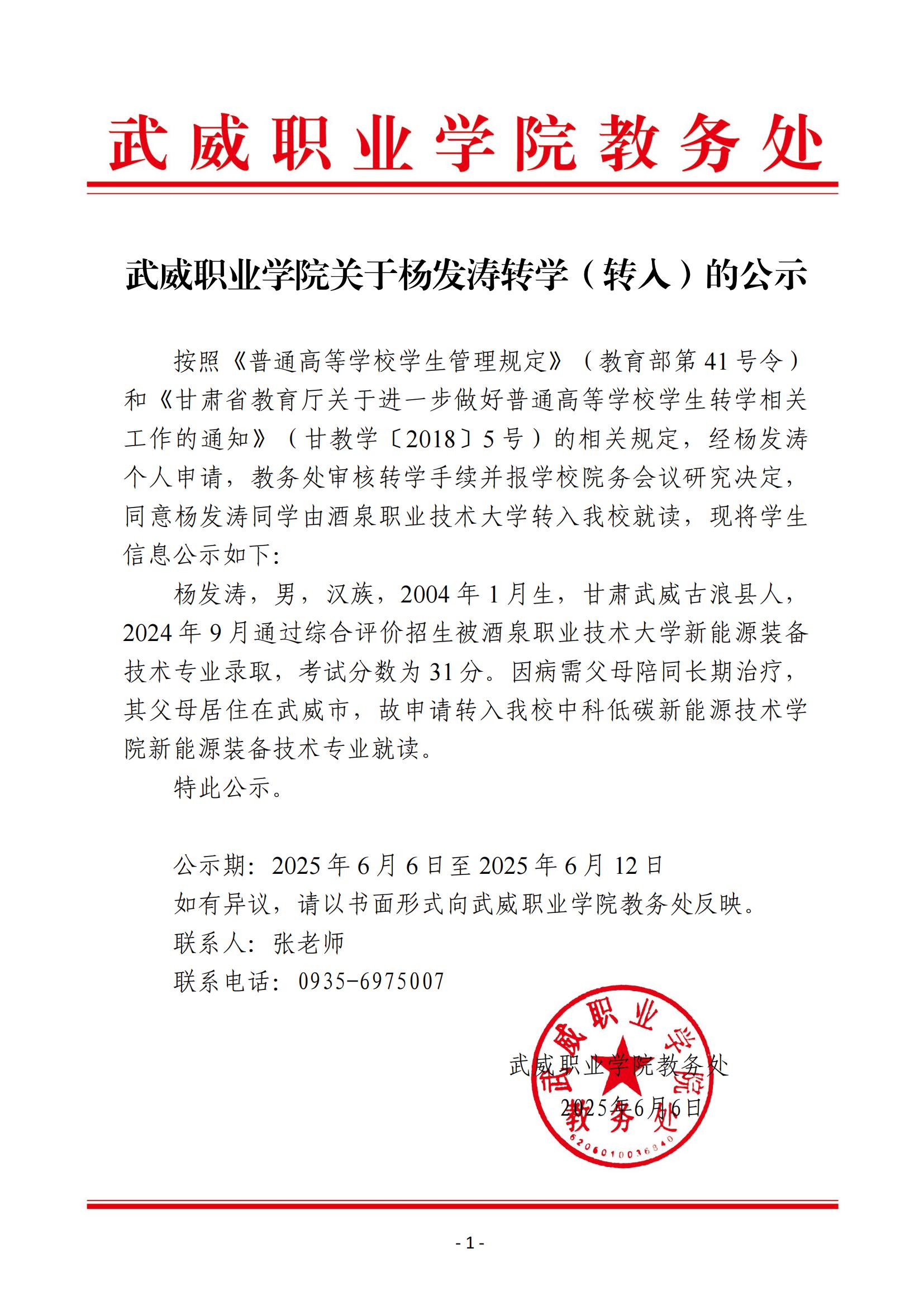 武威職業(yè)學(xué)院關(guān)于楊發(fā)濤轉(zhuǎn)學(xué)(轉(zhuǎn)入)的公示