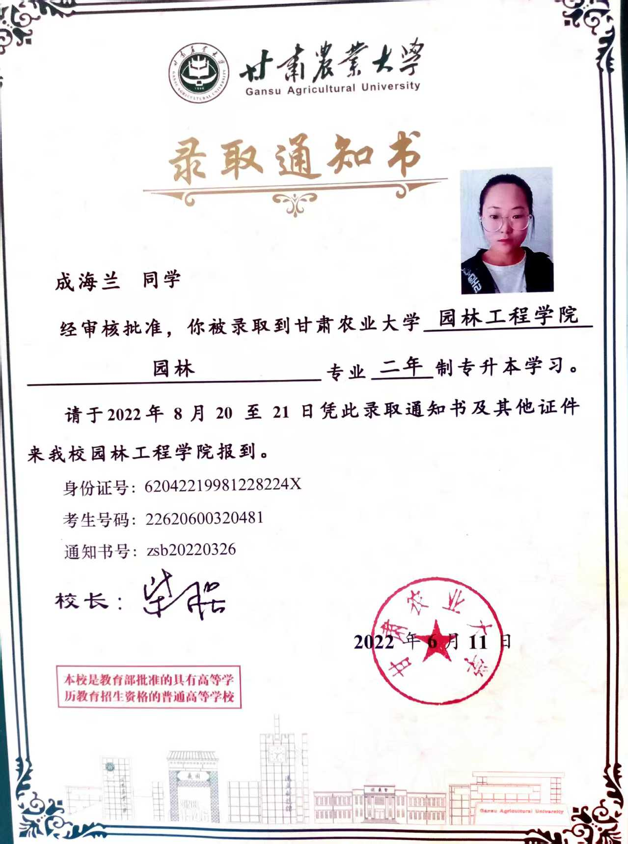 畢業(yè)感言:畢業(yè)幾年,母校的教誨始終銘記于心。感謝武威職業(yè)學(xué)院給予我的知識(shí)與力量,讓我在農(nóng)業(yè)領(lǐng)域能不斷前行,未來(lái)我也將繼續(xù)努力,為行業(yè)發(fā)展貢獻(xiàn)更多力量。