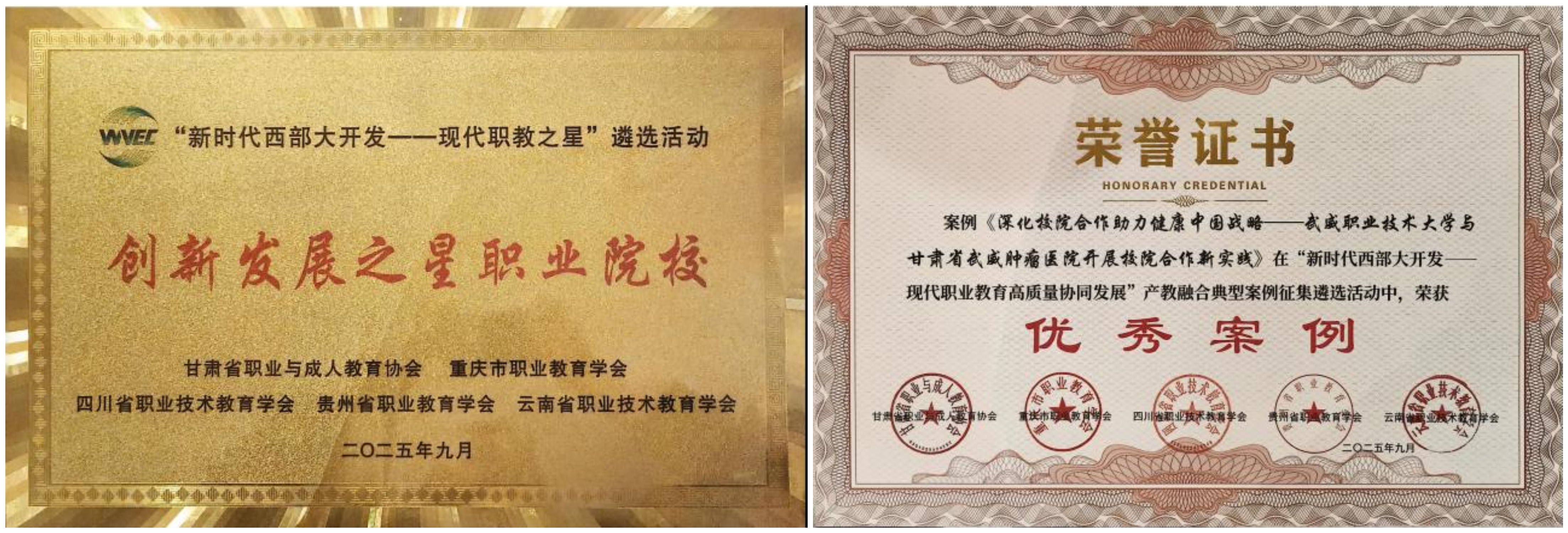 近日,從“新時(shí)代西部大開(kāi)發(fā)——現(xiàn)代職業(yè)教育高質(zhì)量協(xié)同發(fā)展(蘭州)大會(huì)”上傳來(lái)喜訊,武威職業(yè)技術(shù)大學(xué)在甘肅省職業(yè)與成人教育協(xié)會(huì)組織的“新時(shí)代西部大開(kāi)發(fā)——現(xiàn)代職教之星”和“新時(shí)代西部大開(kāi)發(fā)——產(chǎn)教融合典型案例”征集遴選活動(dòng)中榮獲兩項(xiàng)重要榮譽(yù)。學(xué)校獲評(píng)“創(chuàng)新發(fā)展之星職業(yè)院校”,《深化校院合作助力健康中國(guó)戰(zhàn)略——武威職業(yè)技術(shù)大學(xué)與甘肅省武威腫瘤醫(yī)院開(kāi)展校院合作新實(shí)踐》榮獲“產(chǎn)教融合典型案例優(yōu)秀案例”。