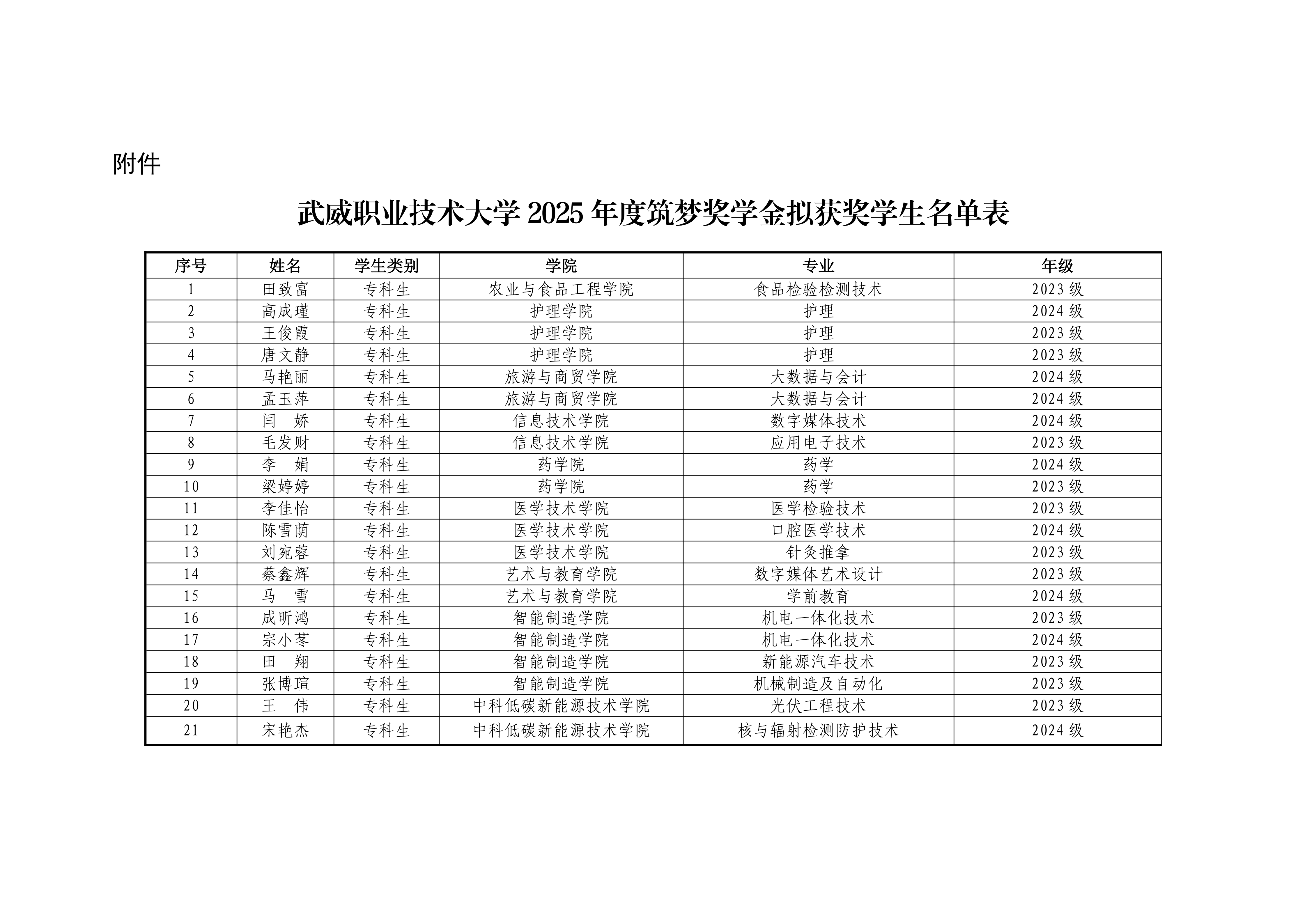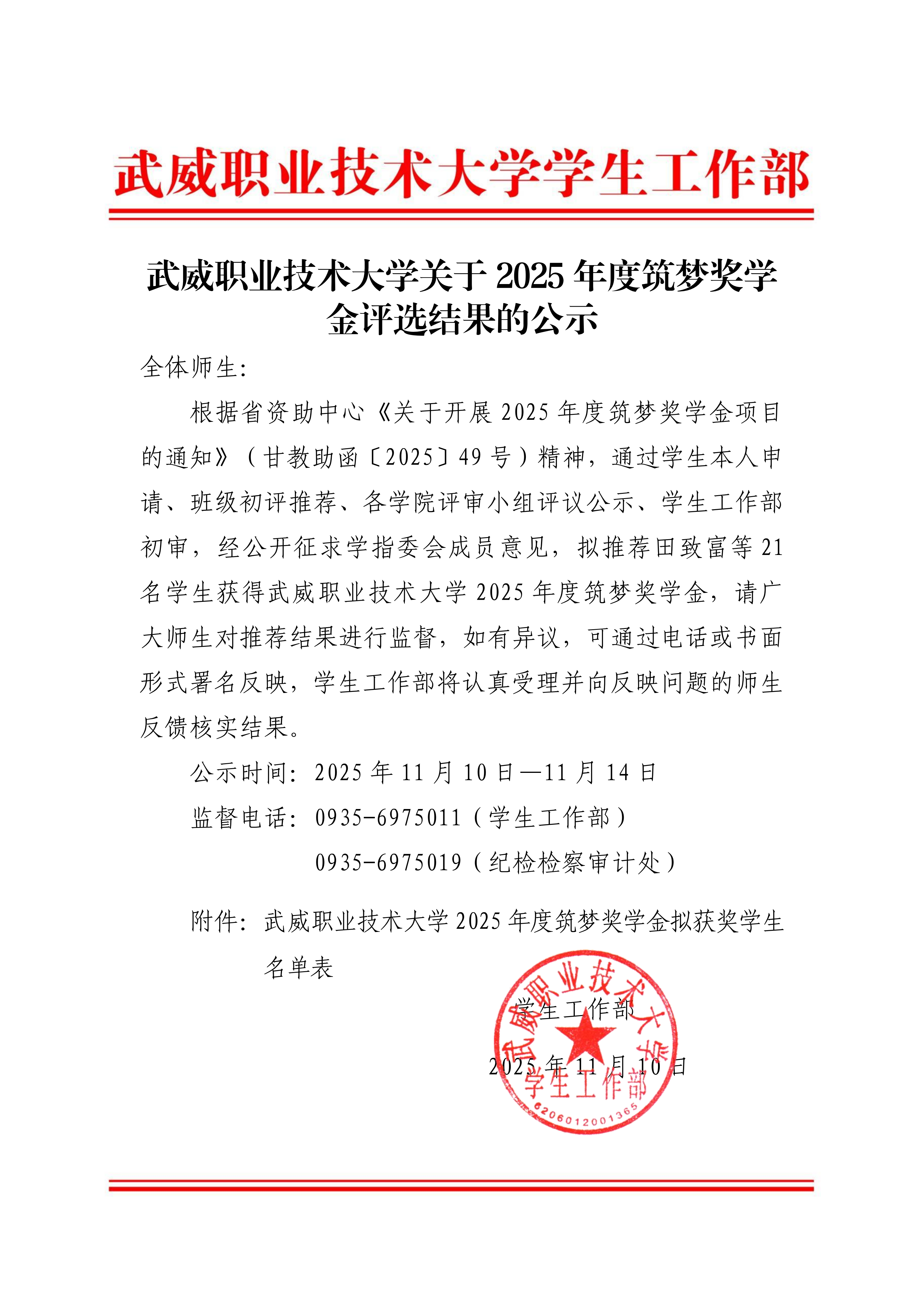 武威職業(yè)技術大學關于2025年度筑夢獎學金評選結果的公示