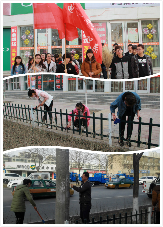 電子信息工程系團總支結(jié)合團市委、院團委《關(guān)于開展城鄉(xiāng)環(huán)境衛(wèi)生整治青年志愿服務活動的通知》安排,3月3日下午16:30組織20名團員青年在學院北門口道路兩側(cè)開展了衛(wèi)生死角清掃,柵欄清潔,果皮箱清潔,公交站臺清潔,小廣告清理,垃圾清運。學生志愿者盡己所能,服務社會,傳播勞動信念,為建設美好社會貢獻自己的一份微薄力量。