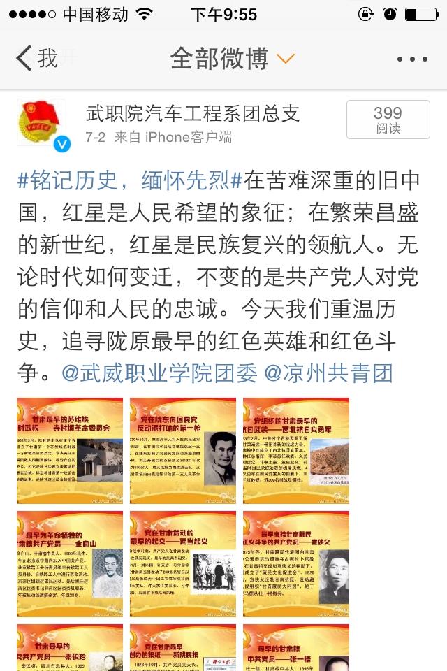 新媒體是對(duì)團(tuán)員青年進(jìn)行宣傳教育的一塊重要的輿論陣地,汽車(chē)工程系團(tuán)總支通過(guò)青媒中心設(shè)立的微信公眾平臺(tái)、新浪微博、QQ空間等多種手段,通過(guò)發(fā)布中國(guó)人民抗戰(zhàn)歷史知識(shí)、設(shè)立紀(jì)念抗日戰(zhàn)爭(zhēng)70周年話(huà)題等多種形式,以圖文并茂的方式給團(tuán)員青年進(jìn)行了一次中國(guó)人民抗戰(zhàn)大普及和大討論,使團(tuán)員青年在學(xué)習(xí)知識(shí)和討論觀點(diǎn)中,堅(jiān)定理想信念,培養(yǎng)愛(ài)國(guó)情操、樹(shù)立歷史使命、珍惜美好生活、勿忘國(guó)恥,展望未來(lái)。