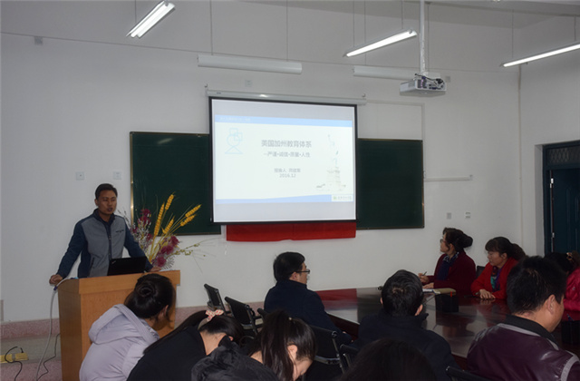 晏素珍就2016年我系教師培訓(xùn)工作做了簡單回顧與總結(jié),隨后蔡飛從美國文化入手,介紹了他們在美國加利福尼亞州社區(qū)學(xué)院學(xué)習(xí)的基本情況,分享了實踐教育教學(xué)的信息、理念、方法、感受。龔建軍從美國教育體系著手,分享了他在美國加利福尼亞州社區(qū)學(xué)院參加的“了解美國現(xiàn)代教育教學(xué)理念,全面提高骨干教師專業(yè)建設(shè)與實踐能力”培訓(xùn)中的所學(xué)所聞,重點介紹了美國職業(yè)教育體系和職業(yè)教育教學(xué)及學(xué)習(xí)模式。