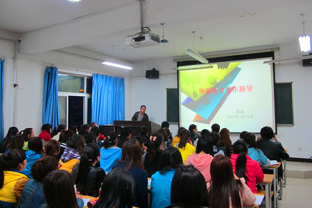 系主任晏素珍對本次畢業(yè)生畢業(yè)論文(設計)做了三點要求,一是全體畢業(yè)生要高度重視畢業(yè)論文(設計)的寫作;二是嚴格按照指導教師的要求保質保量的完成論文;三是每位指導老師對論文指導工作要認真負責、耐心細致。蔡海老師做了題為《畢業(yè)生論文寫作指導》的報告,主要從論文格式要求、文獻查詢方法、論文寫作方法三個方面給同學們做了深入淺出的講解,受到同學們的熱烈歡迎。