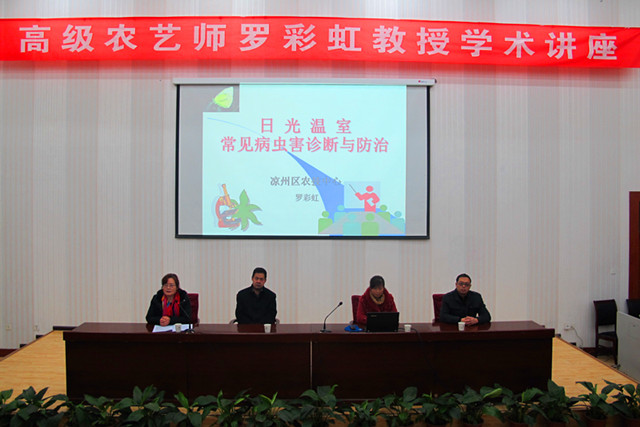 武威市涼州區(qū)農(nóng)業(yè)技術(shù)推廣中心高級(jí)農(nóng)藝師羅彩虹教授結(jié)合自身多年工作經(jīng)驗(yàn),做了題為《日光溫室常見(jiàn)病蟲(chóng)害診斷與防治》的專題講座。講座緊緊圍繞涼州區(qū)日光溫室常見(jiàn)侵染性病害、植物生理病害、常見(jiàn)蟲(chóng)害的癥狀識(shí)別,做了非常到位的講解。同時(shí)也針對(duì)不同的病蟲(chóng)害提出了相應(yīng)的富有成效的綜合防治措施。