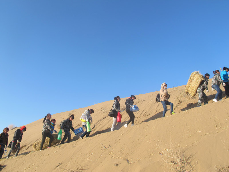 到達(dá)治沙造林現(xiàn)場(chǎng)后,師生按照劃分好的區(qū)域,在現(xiàn)場(chǎng)技術(shù)人員的指導(dǎo)下布線、挖坑、鋪草、壓沙等動(dòng)作,齊心協(xié)力完成了預(yù)定的治沙造林任務(wù)。