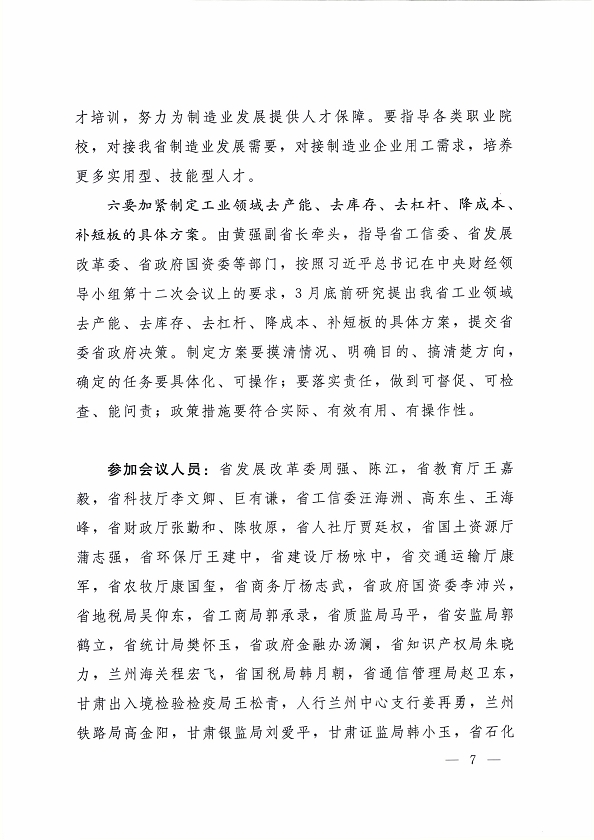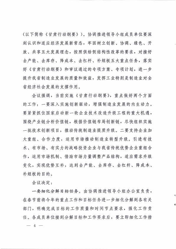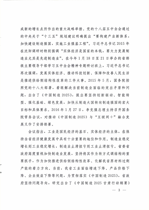 2016 年 1 月 30 日,省委副書記、省長、中國制造 2025甘肅行動綱要協(xié)調(diào)推進(jìn)領(lǐng)導(dǎo)小組組長劉偉平主持召開了協(xié)調(diào)推進(jìn)領(lǐng)導(dǎo)小組第一次會議,研究部署我省行動綱要的協(xié)調(diào)和推進(jìn)工作。現(xiàn)將《中國制造 2025 甘肅行動綱要協(xié)調(diào)推進(jìn)領(lǐng)導(dǎo)小組第一次會議紀(jì)要》轉(zhuǎn)發(fā)你們。