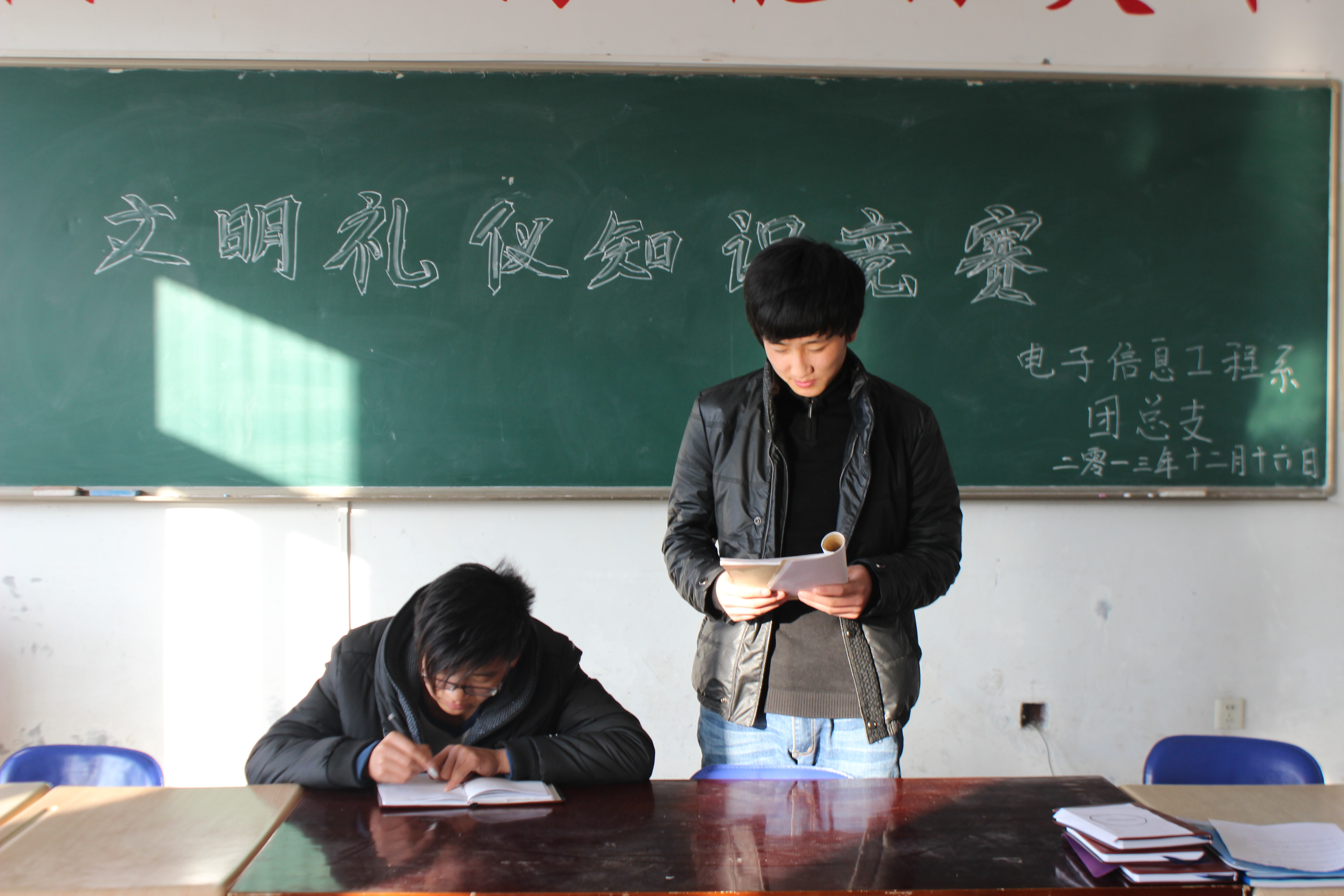 2013年12月16日晚,電子信息工程系團(tuán)總支在1-304教室組織開展電信系文明禮儀知識(shí)競賽;來自電信系2012、2013級8個(gè)大專班的24名同學(xué)參加此次活動(dòng)。