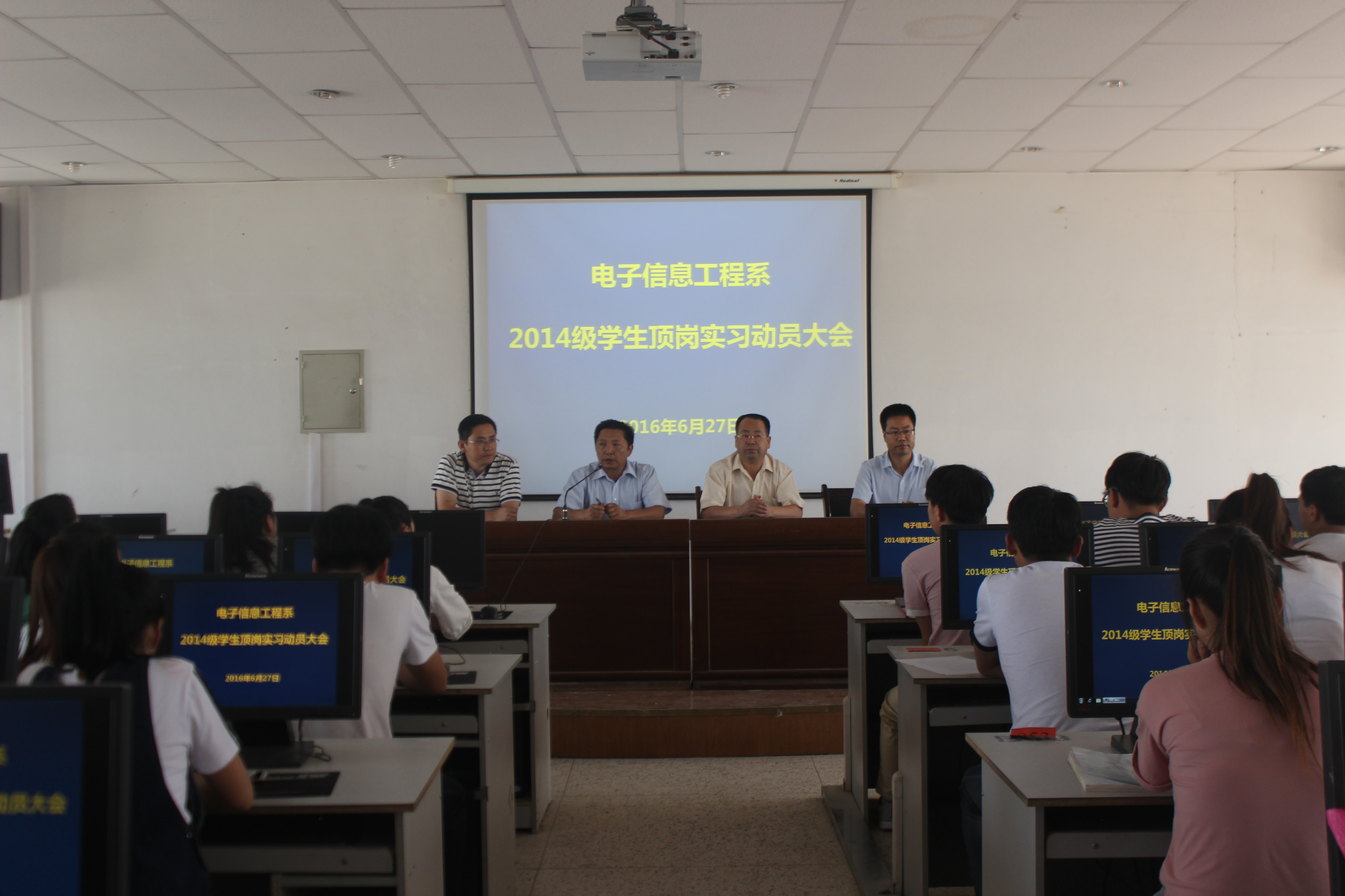 2016年6月27日下午3點(diǎn),電子信息工程系2014級(jí)學(xué)生頂崗實(shí)習(xí)動(dòng)員大會(huì)在尚德樓十一號(hào)機(jī)房舉行。系黨總支書(shū)記袁青年、系主任白玉珍、副書(shū)記張伯成,班主任鄧偉華、唐宗舜、孫麗山、陳平及2014級(jí)全體學(xué)生參加頂崗實(shí)習(xí)動(dòng)員大會(huì)。
