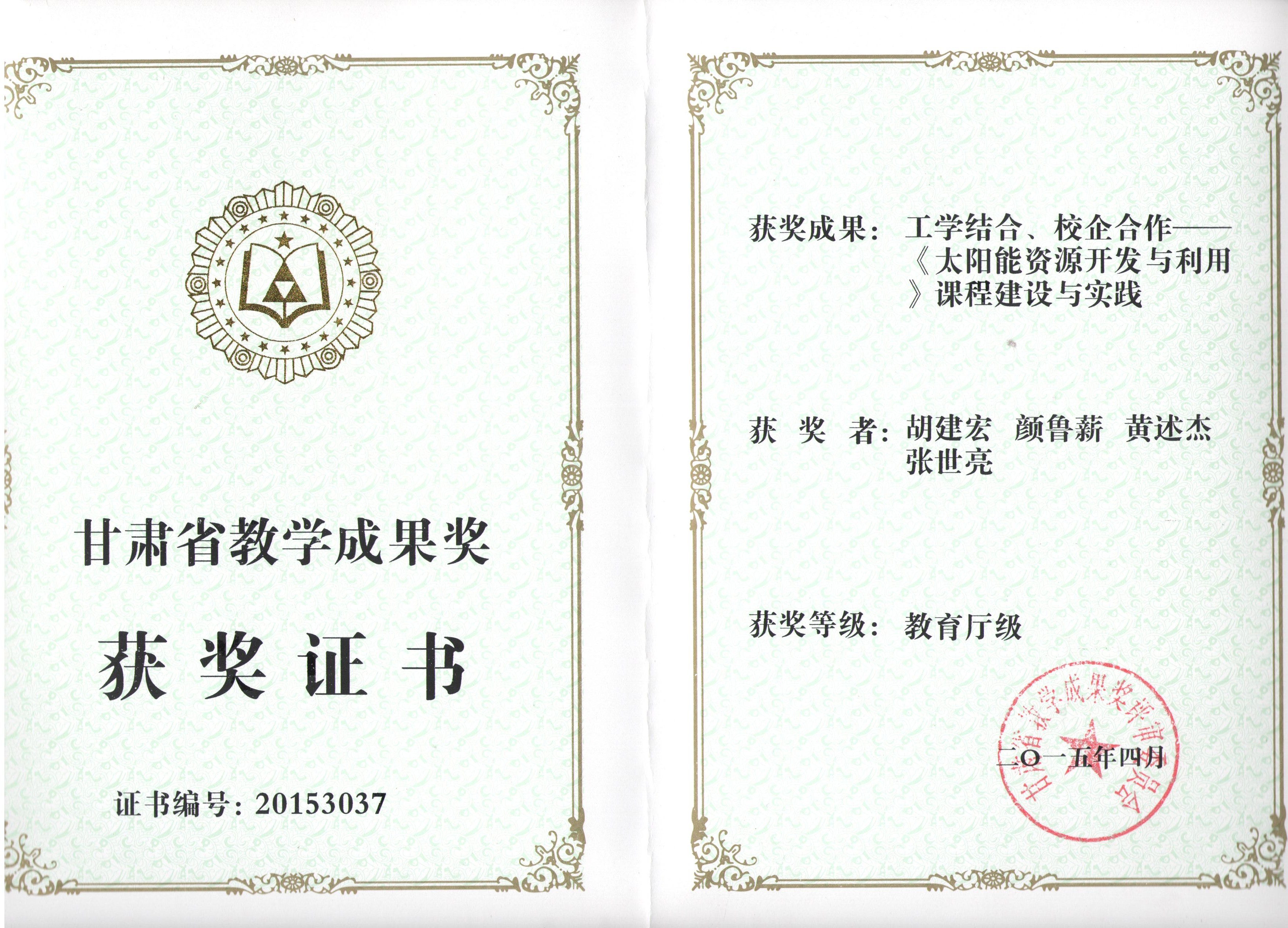 《太陽能資源開發(fā)與利用》課程建設(shè)與實(shí)踐榮獲甘肅省教學(xué)成果獎(jiǎng)