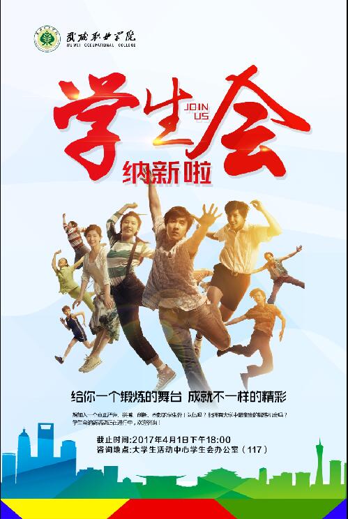 武威職業(yè)學院學生會是在學院黨委領導下,院團委指導下,學生自發(fā)組織的群眾性學生組織。為進一步加強學院學生會隊伍建設,為廣大同學提供一個自我鍛煉的平臺,院團委研究決定面向2016級全體同學公開招聘學院學生會干部。現(xiàn)將具體事宜通知如下: