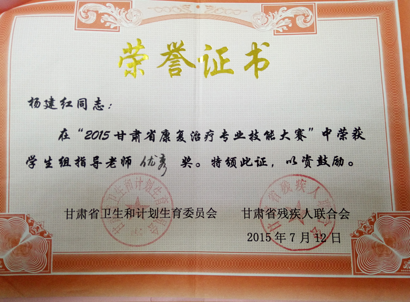 楊建紅榮獲“2015甘肅省康復(fù)治療專業(yè)技能大賽”學(xué)生組優(yōu)秀指導(dǎo)教師