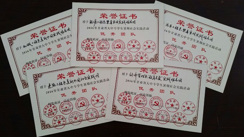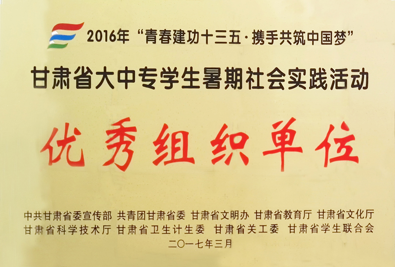 學(xué)院團(tuán)委被省委宣傳部、團(tuán)省委、省教育廳等九個(gè)部門(mén)評(píng)為2016年甘肅省大中專(zhuān)學(xué)生暑期社會(huì)實(shí)踐活動(dòng)“優(yōu)秀組織單位”,五個(gè)實(shí)踐團(tuán)隊(duì)被評(píng)為省級(jí)“優(yōu)秀團(tuán)隊(duì)”,五名同志被評(píng)為“先進(jìn)個(gè)人”,五名教師被評(píng)為 “優(yōu)秀指導(dǎo)教師”。