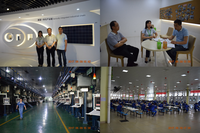 晶科能源控股有限公司是全球?yàn)閿?shù)不多的擁有垂直一體化產(chǎn)業(yè)鏈的光伏制造企業(yè),業(yè)務(wù)涵蓋了優(yōu)質(zhì)的硅錠、硅片、電池片生產(chǎn)、高效單多晶光伏組件制造以及光伏電站建設(shè)等領(lǐng)域,是目前全球光伏組件生產(chǎn)的龍頭企業(yè),2016年中國(guó)500強(qiáng)企業(yè)。公司負(fù)責(zé)人帶領(lǐng)考察人員參觀了公司現(xiàn)代化的生產(chǎn)車間、晶科商學(xué)院、員工宿舍和食堂,介紹了公司的發(fā)展情況和用人需求。在考察過程中,考察人員就公司給學(xué)生提供的工作崗位、待遇、住宿、安全管理等情況與企業(yè)負(fù)責(zé)人進(jìn)行了深入交流。