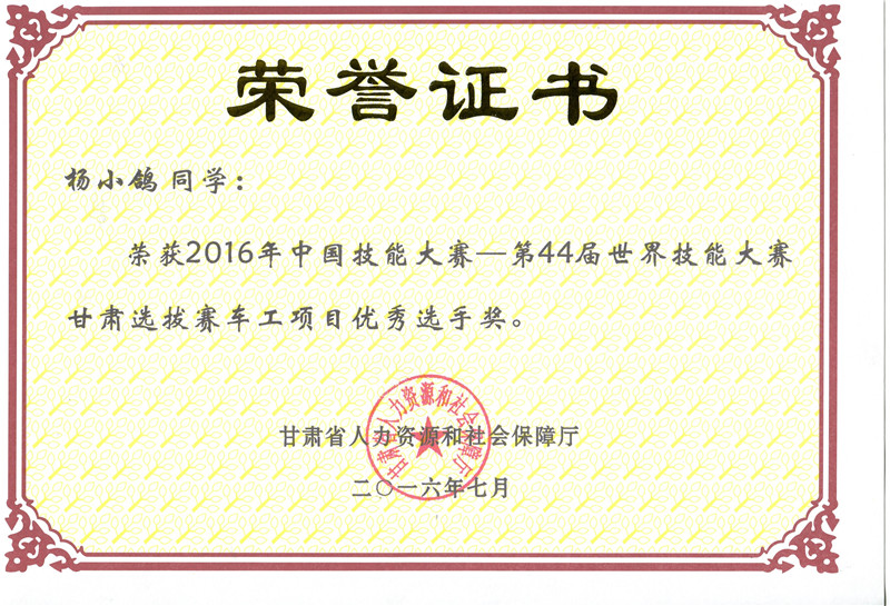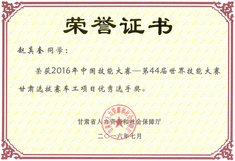第44屆世界技能大賽甘肅選拔賽車工項目優(yōu)秀獎