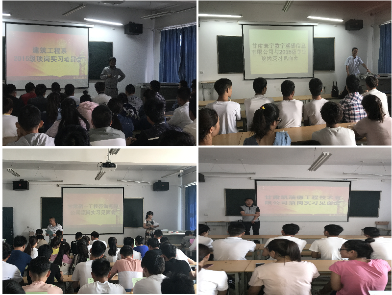 6月8日至16日,甘肅寰宇數(shù)字遙感信息有限公司、甘肅新一工程咨詢有限公司、國誠集團(tuán)、蘭州凱瑞德工程有限公司、武威盛大集團(tuán)等實習(xí)接收單位派專人來校,舉辦企業(yè)宣講會,詳細(xì)地介紹了用人單位的管理制度、日常生活、工作崗位、薪酬待遇等,并與系上洽談了學(xué)生頂崗實習(xí)合作辦法、責(zé)任義務(wù)、安全保障、就業(yè)等方面的合作細(xì)節(jié)。