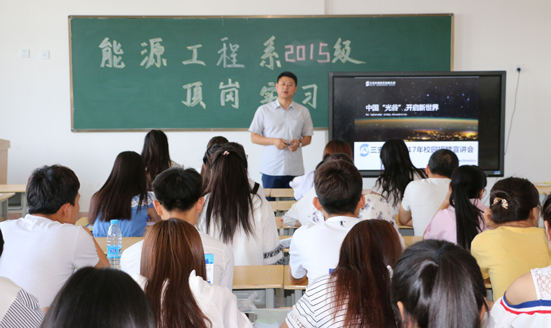 安徽三安光電有限公司在行樹樓504教室開展了頂崗實習宣講會,2015級農村能源與環(huán)境技術大專班和2015級太陽能光熱技術及應用大專班學生參加了此次宣講會。李明經(jīng)理就企業(yè)概況、企業(yè)文化、崗位需求、薪酬待遇等方面向同學們做了介紹,并對有應聘意向的同學進行了面試,最終共有50人被安徽三安光電有限公司錄用。