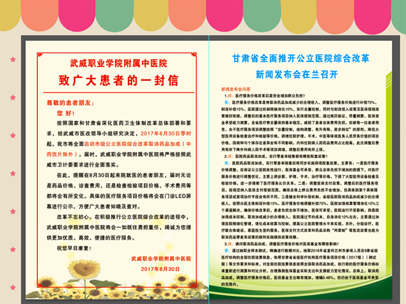 為了搞好公立醫(yī)院綜合改革,醫(yī)院加大對(duì)啟動(dòng)公立醫(yī)院綜合改革工作的宣傳力度,通過醫(yī)院門診大廳LED屏幕、電子顯示屏、宣傳展架、宣傳彩頁及微信公眾號(hào)推送等多種方式擴(kuò)大醫(yī)院綜合改革宣傳,對(duì)患者及家屬做好正面引導(dǎo)工作,為醫(yī)院綜合改革任務(wù)的落實(shí)營造良好的氛圍。