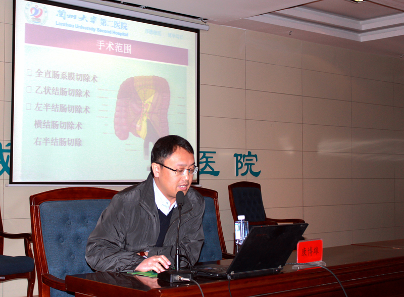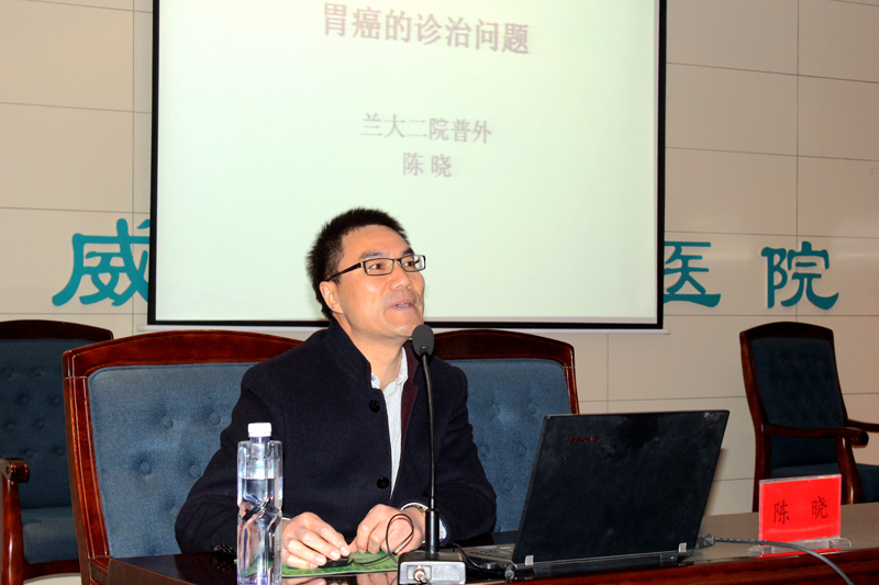 醫(yī)院邀請到蘭州大學第二醫(yī)院普外三科主任、胃腸外科主任、主任醫(yī)師陳曉和普外二科副主任,副主任醫(yī)師康博雄為大家作學術講座。陳曉主講了《胃癌的診治問題》,并與大家分享了他在法國醫(yī)院和美國醫(yī)院進修學習時的一些感想和見聞。陳曉在講座中結(jié)合臨床體會說:許多胃癌患者在就診時已經(jīng)發(fā)展為中晚期,失去了手術機會。他呼吁全社會要認識到對胃癌高發(fā)地區(qū)、高危年齡、高危人群進行篩查的必要性。醫(yī)生要對有癥狀的患者及早進行胃鏡檢查,爭取做到早發(fā)現(xiàn)、早診斷、早治療。講座中,陳曉就外科手術吻合方式選擇與直屬附屬醫(yī)院外科主任滕志勇醫(yī)生進行了現(xiàn)場互動。