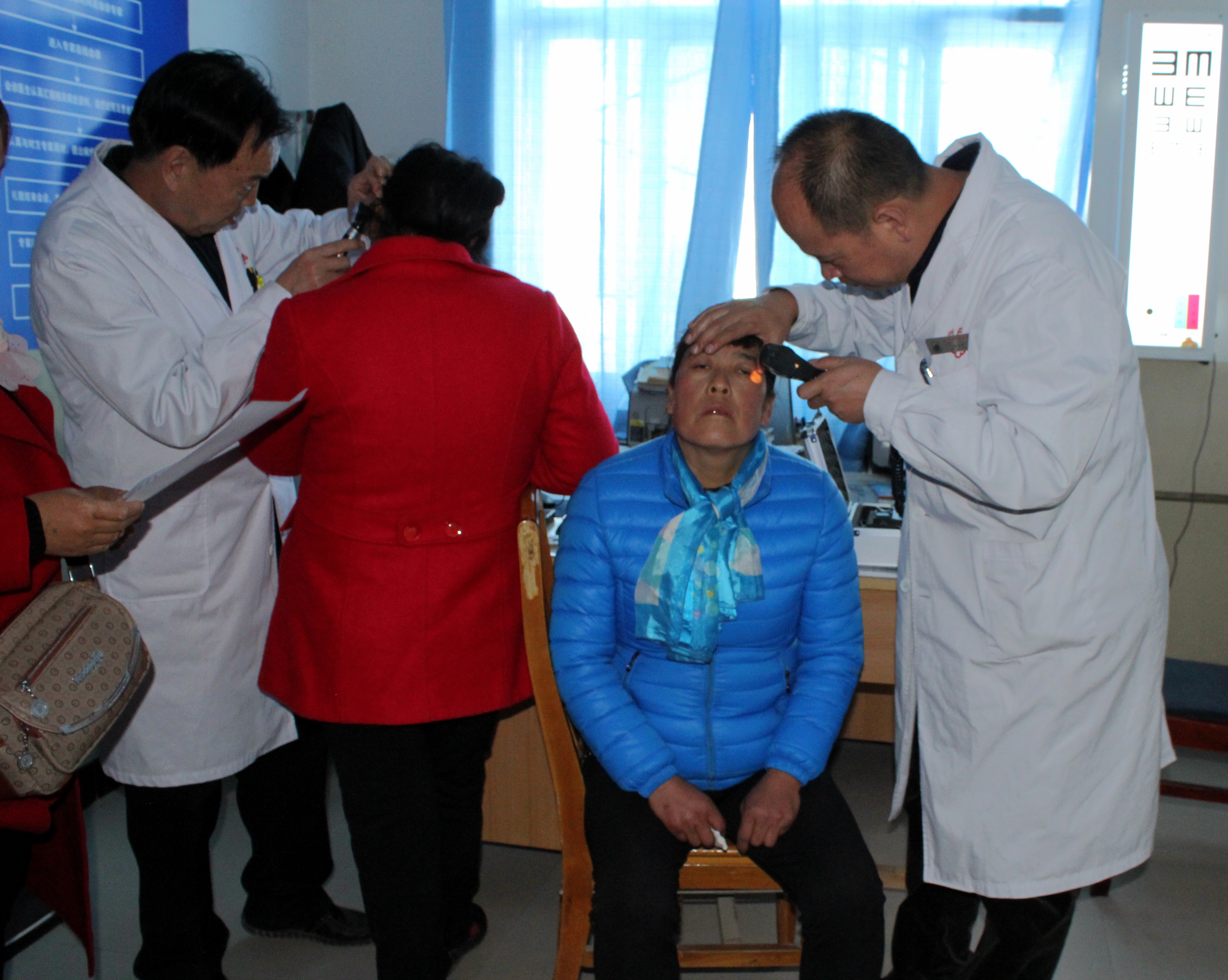 在衛(wèi)生院內(nèi)義診現(xiàn)場,由于診室面積所限,患者們遵照護(hù)士安排意見,按病種分成兩組排隊(duì)候診。陶醫(yī)生為患有干眼癥、結(jié)膜炎、白內(nèi)障、青光眼、翼狀胬肉、斜視等眼科疾病的患者開展常規(guī)檢查,并開具處方,提供健康用眼衛(wèi)生和治療方案。王醫(yī)生為患者提供耳鼻喉常規(guī)檢查服務(wù)。對于患有中耳炎、慢性咽炎、耳鳴耳聾、過敏性鼻炎等疾病的患者,王醫(yī)生現(xiàn)場給予用藥指導(dǎo)和今后的治療方案。