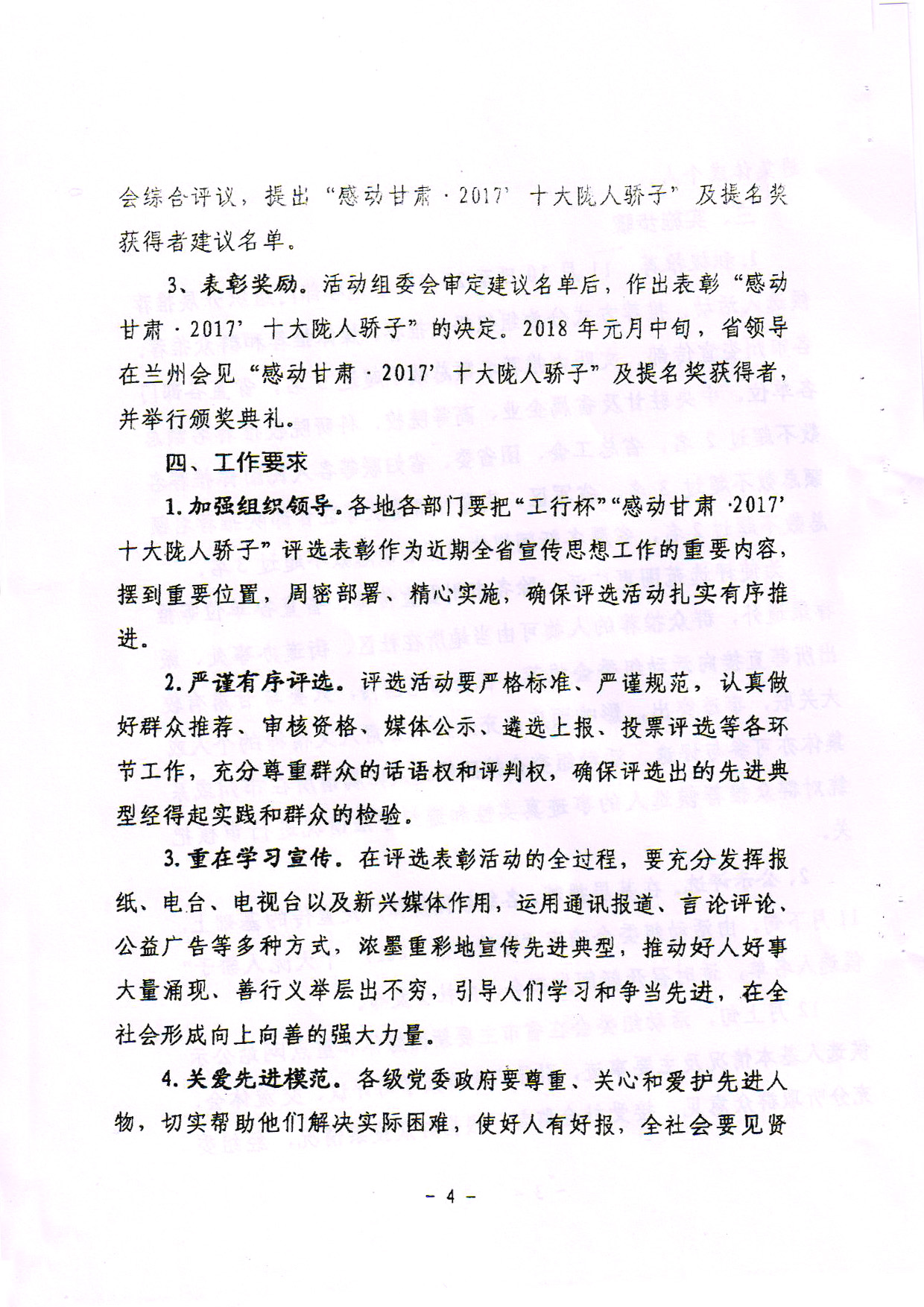 2.推薦對象必須按照《中共甘肅省委宣傳部〈關于做好‘工行杯’感動甘肅·2017十大隴人驕子候選人推薦工作的通知》中的推薦條件確定。