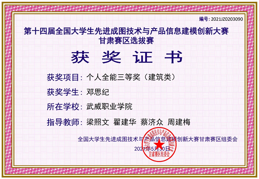 第十四屆全國(guó)大學(xué)生先進(jìn)成圖技術(shù)與產(chǎn)品信息建模創(chuàng)新大賽甘肅賽區(qū)選拔賽獲個(gè)人全能三等獎(jiǎng)(建筑類(lèi))